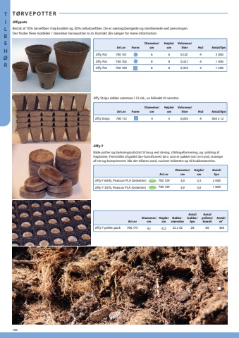 106TILBET%u00d8RVEPOTTERJiffypots Best%u00e5r af 70% t%u00f8rvefiber i h%u00f8j kvalitet og 30% cellulosefiber. De er n%u00e6ringsberigede og steriliserede ved presningen.Der findes flere modeller / st%u00f8rrelser t%u00f8rvepotter m.m. Kontakt din s%u00e6lger for mere informationJiffy-7 B%u00e5de potter og dyrkningssubstrat til brug ved s%u00e5ning, stiklingeformering, og prikling af fr%u00f8planter. Fremstillet af g%u00f8det (lav-humificeret) t%u00f8rv, som er pakket ind i en tynd, str%u00f8mpe af net og komprimeret. N%u00e5r der tilf%u00f8res vand, svulmer briketten op til krukkest%u00f8rrelse.Jiffy Strips sidder sammen i 12 stk., se billedet til venstre.Art.nrFormDiameter/cmH%u00f8jde/cmVolumen/literHulAntal/fpnJiffy Pot700 101660,12043 000Jiffy Pot700 102880,32141 400Jiffy Pot700 109880,35441 200Art.nrFormDiameter/cmH%u00f8jde/cmVolumen/literHulAntal/fpnJiffy Strips700 112450,0354500 x 12Art.nrDiameter/cmH%u00f8jde/cmBakkest%u00f8rrelseAntal bakke/fpnAntal pellets/br%u00e6dtJiffy7 pelletpack700 1754,14,232 x 522860Art.nrDiameter/cmH%u00f8jde/700 1293,0Jiffy-7 3070, Peatcoir PLA (briketter)700 1393,93,9NYHED