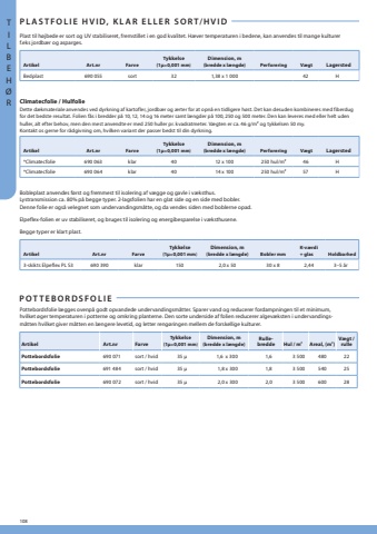 108TILBEH%u00d8RPlast til h%u00f8jbede er sort og UV stabiliseret, fremstillet i en god kvalitet. H%u00e6ver temperaturen i bedene, kan anvendes til mange kulturer f.eks jordb%u00e6r og asparges.ArtikelArt.nrFarveTykkelse(1%u03bc=0,001 mm)Dimension, m(bredde x l%u00e6ngde)PerforeringV%u00e6gtLagerstedBedplast690 055sort321,38 x 1 00042HPLASTFOLIE HVID, KLAR ELLER SORT/HVIDClimatecfolie / HulfolieDette d%u00e6kmateriale anvendes ved dyrkning af kartofler, jordb%u00e6r og %u00e6rter for at opn%u00e5 en tidligere h%u00f8st. Det kan desuden kombineres med fiberdug for det bedste resultat. Folien f%u00e5s i bredder p%u00e5 10, 12, 14 og 16 meter samt l%u00e6ngder p%u00e5 100, 250 og 500 meter. Den kan leveres med eller helt uden huller, alt efter behov, men den mest anvendte er med 250 huller pr. kvadratmeter. V%u00e6gten er ca. 46 g/m%u00b2 og tykkelsen 50 my.Kontakt os gerne for r%u00e5dgivning om, hvilken variant der passer bedst til din dyrkning.ArtikelArt.nrFarveTykkelse(1%u03bc=0,001 mm)Dimension, m(bredde x l%u00e6ngde)PerforeringV%u00e6gtLagersted*Climatecfolie690 063klar4012 x 100250 hul/m%u00b246H*Climatecfolie690 064klar4014 x 100250 hul/m%u00b257HBobleplast anvendes f%u00f8rst og fremmest til isolering af v%u00e6gge og gavle i v%u00e6ksthus.Lystransmission ca. 80% p%u00e5 begge typer. 2lagsfolien har en glat side og en side med bobler.Denne folie er ogs%u00e5 velegnet som undervandingsm%u00e5tte, og da vendes siden med boblerne opad. Elpeflex-folien er uv stabiliseret, og bruges til isolering og energibesparelse i v%u00e6ksthusene.Begge typer er klart plast.ArtikelArt.nrTykkelse(1%u03bc=0,001 mm)Dimension, m(bredde x l%u00e6ngde)Bobler mmK-v%u00e6rdi + glasHoldbarhed3skikts Elpeflex PL S3 690 3901502,0 x 5030 x 82,443%u20135 %u00e5rArtikelArt.nrFarveTykkelse(1%u03bc=0,001 mm)Dimension, m(bredde x l%u00e6ngde)RullebreddeHul / m%u00b2Areal, (m%u00b2)V%u00e6gt / Pottebordsfolie690 071sort / hvid35 %u03bc1,6 x 3001,63 500480Pottebordsfolie691 484sort / hvid35 %u03bc1,8 x 3001,83 500540Pottebordsfolie690 072sort / hvid35 %u03bc2,0 x 3002,03 500600Pottebordsfolie l%u00e6gges ovenp%u00e5 godt opvandede undervandingsm%u00e5tter. Sparer vand og reducerer fordampningen til et minimum, hvilket %u00f8ger temperaturen i potterne og omkring planterne. Den sorte underside af folien reducerer algev%u00e6ksten i undervandingsm%u00e5tten hvilket giver m%u00e5tten en l%u00e6ngere levetid, og letter reng%u00f8ringen mellem de forskellige kulturer.POTTEBORDSFOLIE