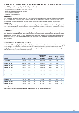 111FIBERDUG / LUTRASIL %u2013 HURTIGERE PLANTE ETABLERINGArtikelArt.nrFarveV%u00e6gtDimension, m(bredde x l%u00e6ngde)RullebreddeAreal, (m%u00b2)V%u00e6gt / 2,15 x 250537Lutrasil Pro 19691 304hvid4,25 x 2501062Lutrasil Pro 19x691 310hvid10,5 x 2502625Lutrasil Pro 19x691 313hvid12,8 x 1001280Lutrasil Pro 19x691 314hvid1912,8 x 2502,053200Lutrasil Pro 19x691 320hvid1916,0 x 2502,05400079Lutrasil Pro 19x691 323hvid1913,6 x 2502,05340068Lutrasil Pro 19x691 406hvid1920,5 x 2502,055125101Fiberdug 19691 702Hvid232,4 x 1002,052405Lutrasil Pro 23x 691 335Hvid2312,8 x 2502,053 20077Lutrasil Pro 23x691 329Hvid2316,0 x 2502,054 00095Lutrasil & Agrisoft fiberdug %u2013 19 gr (17, 23 og 30 gr er skaffevare)%u2022Beskytter planterne mod lettere frost i kolde perioder%u2022Effektiv beskyttelse mod flyvende insekter %u2022Hurtigere planteetablering%u2022Forl%u00e6nger dyrkningss%u00e6sonenEGENSKABER: Er en tynd dug af h%u00f8j kvalitet, som bet%u00e5r af 100 % polypropen. Med syede s%u00f8mme og meget j%u00e6vn fiberfordeling. Lutrasil Pro har meget h%u00f8j tr%u00e6k og rivefasthed og den slipper b%u00e5de luft og vand igennem og har en lysgennemgang p%u00e5 ca 90 %. Den er en af de st%u00e6rkeste fiberduge p%u00e5 markedet og kan, alt efter anvendelses omr%u00e5de anvendes til 2%u20133 kulturer. ST%u00d8RRELSER: Lutrasil findes i flere forskellige kvaliteter og kan leveres fra vores lager i bredder fra 2,0%u201320,5 meter. Standardl%u00e6ngden p%u00e5 rullerne er 250 meter, dog findes enkelte i 100 meters ruller. Maximal bredde p%u00e5 rullerne ved leveringen er 2,05 meter. Rullerne med bredder fra 10,5 meter er normalt med kantforst%u00e6rkning og disse markeres med et X eller KF i tabellen nedenfor. ANVENDELSE:Fiberdug anvendes hovedsagligt til at d%u00e6kke gr%u00f8ngtsager, b%u00e6r og kartofler men anvendes ogs%u00e5 p%u00e5 boldbaner, golfbaner og til d%u00e6kning af planteskolekulturer. Holdbarheden og frostbeskyttelses egenskaberne %u00f8ges med t%u00e6theden/tykkelsen p%u00e5 dugen og er h%u00f8jest p%u00e5 Lutrasil Pro 23 og 30. Lutrasil findes i andre m%u00e5l og kvaliteter hos leverand%u00f8ren og kan leveres ved bestilling i god tid. Vores leverand%u00f8r kan ogs%u00e5 producere bredder i specielm%u00e5l men s%u00e5 er minimum bestillingen p%u00e5 7500 lbm. Meter. Glaeser FIBERDUG %u2013 17 gr, 19 gr, 22 gr, 23 gr, 30 grForuden Lutrasil fiberdug tilbyder vi ogs%u00e5 Glaeser fiberdug, som i de senere %u00e5r er blevet en stor leverand%u00f8r af st%u00e6rk og h%u00f8j kvalitet fiberdug. Der findes mange forskellige muligheder med hensyn til bredder og l%u00e6ngder i tykkelser p%u00e5 17, 19, 22, 23 og 30 g/m%u00b2. Ved tidlig bestilling er der desuden mulighed for speciall%u00e6ngder. Standardl%u00e6ngderne er 100, 250 og 500 meter.Kontakt os for at h%u00f8re mere om alle mulighederne.x = kantforst%u00e6rketHar du behov for andre bredder/l%u00e6ngder s%u00e5 kontakt os og h%u00f8r om mulighederne!