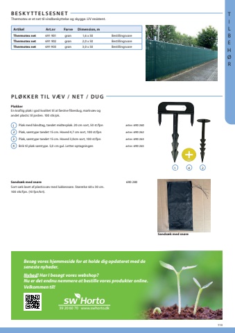 113PL%u00d8KKER TIL V%u00c6V / NET / DUGPl%u00f8kkerEn kraftig pl%u00f8k i god kvalitet til at f%u00e6stne fiberdug, markv%u00e6v og andet plastic til jorden. 100 stk/pk.Pl%u00f8k med h%u00e5ndtag, tandet midterpl%u00f8k. 20 cm sort, 50 st/fpn artnr: 690 260Pl%u00f8k, s%u00f8mtype tandet 15 cm. Hoved 4,7 cm sort, 100 st/fpnartnr: 690 262Pl%u00f8k, s%u00f8mtype tandet 15 cm. Hoved 3,0cm sort, 100 st/fpnartnr: 690 263Brik til pl%u00f8k s%u00f8mtype. 5,0 cm gul. Letter optagningen artnr: 690 265100 stk/fpn. (10 fpn/krt).1342ArtikelArt.nrFarveDimension, mThermotex net691 901gr%u00f8n1,6 x 50BestillingsvareThermotex net691 902gr%u00f8n2,0 x 50BestillingsvareThermotex net691 903gr%u00f8n3,0 x 50BestillingsvareBESKYTTELSESNETThermotex er et net til vindbeskyttelse og skygge. UV resistent.Sands%u00e6k med sn%u00f8reBes%u00f8g vores hjemmeside for at holde dig opdateret med de seneste nyheder.Nyhed! Har I bes%u00f8gt vores webshop?Nu er det endnu nemmere at bestille vores produkter online.Velkommen til!39 20 60 70 www.swhorto.dk