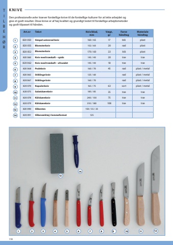 118TILBEKNIVEDen professionelle avler kr%u00e6ver forskellige knive til de forskellige kulturer for at lette arbejdet og give et godt resultat. Disse knive er af h%u00f8j kvalitet og grundigt testet til forskellige arbejdsmetoder og godt tilpasset til h%u00e5nden.131234567891114Art.nrTekstKniv/blad, mmV%u00e6gt, Farve h%u00e5ndtagMateriale h%u00e5ndtag820 050Simpel universal kniv160 / 65plast820 055Blomsterkniv152 / 60plast820 052Blomsterkniv 170 / 60plast820 060Kniv med tr%u00e6skaft %u2013 spids145 / 40tr%u00e6820 062Kniv med tr%u00e6skaft %u2013 afrundet145 / 40tr%u00e6820 068Podekniv160 / 70plast / metal820 065Stiklinge kniv125 / 60plast / metal820 067Stiklinge kniv160 / 70plast / metal820 070Kopulerkniv165 / 75plast / metal820 075Salatsk%u00e6rekniv185 / 85 tr%u00e6820 078K%u00e5lsk%u00e6rekniv240 / 130 820 079K%u00e5lsk%u00e6rekniv310 / 180820 090Slibesten150 / 55 / 25 820 091Slibev%u00e6rkt%u00f8j i lommeformat 12514111210425678913