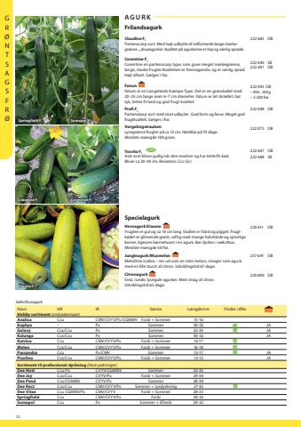 12GR%u00d8NTSAGSFR%u00d8SpecielagurkFrugten er gul og ca 10 cm lang. Skallen er h%u00e5rd og pigget. Frugtk%u00f8det er glinsende gr%u00f8nt, saftig med mange halvh%u00e5rde og spiselige kerner, ligesom k%u00e6rnehuset i en agurk. B%u00f8r dyrkes i v%u00e6ksthus. Mindste m%u00e6ngde 50 fr%u00f8.Jungleagurk/MusmelonMelothria scabra %u2013 ser ud som en mini melon, smager som agurk med en lille touch af citron. Udviklingstid 67 dage. 257 641 Citronagurk Sm%u00e5, runde, lysegule agurker. Med smag af citron. Udviklingstid 65 dage. 220 690 Sumapol FSpringfield F1V%u00e6ksthusagurkNavnHRS%u00e6sonL%u00e6ngde/cmFindes i %u00d8koHobby sortiment (sm%u00e5 pakninger)AnalisaCcuCMV/CVYV/Px/CGMMVFor%u00e5r + Sommer15-16EuphyaSommer30-32GalaxyCca/CcuSommer32-34KalungaCca/CcuPxSommer30-32KatrinaCcuCMV/CVYV/PxFor%u00e5r + Sommer16-17MelenCca/CcuCMV/CVYV/PxFor%u00e5r + Sommer16-18PassandraCcuPx/CMVSommer15-17PicolinoCca/CcuCMV/CVYV/PxFor%u00e5r + Sommer13-15Sortiment til professionel dyrkning (Store pakninger)Dee HostCcu/PxCVYV/CGMMVSommer32-35Dee JayCca/CcuCVYV/PxFor%u00e5r + Sommer29-34Dee PendCcu/CGMMVCVYV/PxSommer28-30Dee RectCca/CcuCMV/CVYV/PxSommer + Lysdyrkning27-32PDee VitaeCcu CGMMV/PxCMV/CVYVFor%u00e5r + Sommer28-33SpringfieldCcuCMV/CVYV/PxFor%u00e5r30-32SumapolCcuPx Sommer + Efter%u00e5r29-32PPPPPAGURKFrilandsagurkClaudine F1Partenocarp sort. Med h%u00f8jt udbytte af velformede lange m%u00f8rkegr%u00f8nne ,, drueagurker. Kvalitet p%u00e5 agurkerne er h%u00f8j og s%u00e6rlig spr%u00f8de.222 685 Corentine F1Corentine en partenocarp type, som giver meget m%u00f8rkegr%u00f8nne, lange, slanke frugter.Kvaliteten er fremragende, og er s%u00e6rlig spr%u00f8d. H%u00f8jt afkast. S%u00e6lges i fr%u00f8.222 690 222 691 Fatum Fatum er en Langelands K%u00e6mpe Type. Det er en gr%u00f8nskallet med 20%u201325 cm lange asier 6%u20137 cm diameter. Fatum er let skr%u00e6llet, har tyk, bitter-fri k%u00f8d og god frugt kvalitet.222 093 %u2013Min. 100 g%u223c 5 500 fr%u00f8Profi F1Partenokarp sort med stort udbytte. God form og farve. Meget god frugtkvalitet. S%u00e6lges i fr%u00f8.222 698 Vorgebirgstrauben Lysegr%u00f8nne frugter p%u00e5 ca 12 cm. H%u00f8stklar p%u00e5 70 dage. Mindste m%u00e6ngde 100 gram.222 072 Travito F1NYHEDAsie som bliver gullig n%u00e5r den modner og har bitterfri k%u00f8d.Bliver ca 30-40 cm. Resistens: Ccc (Sc)222 687 222 688 Claudine FCorentine FTravito F