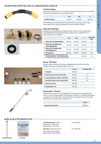 1236ble and exchangeable outlet pipe with inserted dirt strai,hand quick-action valve VANDINGSARTIKLER/SLANGEKOBLINGERJordtermometerpH-stripsM%u00c5LEINSTRUMENTER1245Jord Termometer, 6 stk/pk.art. nr 840 702Letmetal r%u00f8r. 10x325 mm. M%u00e5leomr%u00e5de %u201310 till +60%u00b0C.pH-strips, %u00e6ske med 100 stkart. nr 840 750For hurtig og enkel m%u00e5ling. M%u00e5leomr%u00e5de: 4,5 til 10,0 pH. Brusevander \H%u00e5ndvandere som best%u00e5r af Ergo h%u00e5ndtag, 75 cm aluminiumsr%u00f8r, og plastbruser med 0,7 mm hul. Ampelvanderen best%u00e5r af Ergo h%u00e5ndtag, 75 cm b%u00f8jet aluminiumsr%u00f8r og plastbruser med 200 huller. Tilslutning: R20, indvendg gevind. Kan med fordel kombineres med r%u00f8rtilslutning, artikel 851 338Art.nrKomplet h%u00e5ndvander850 580Tricoflex SlangeNetarmeret slange TricoFlex. PVC slange af h%u00f8j kvalitet. Fleksibel og nem at h%u00e5ndtere, selv ved lave temperaturer. Leveres i ruller %u00e0 50 m.(for h%u00e5ndtering af drikkevand kr%u00e6ves idag ofte ftalat- frie slanger. Vi kan ogs%u00e5 levere s%u00e5danne men det er ikke lagervare men kan bestilles s%u00e6rskilt.)Geka plus koblingerKoblinger med bajonetfatning af h%u00f8jeste kvalitet. Udf%u00f8rt i messing og forsynet med udskiftelige t%u00e6tsluttende pakninger. S%u00e6lges stykvis, nedenfor kan ses hvormange der er i hver pakke.Bruser \Kraftig model, som best%u00e5r af Geka plus slangekobling, kugleventil, h%u00e5ndtag,metalr%u00f8r og aluminiumsspreder med 0,7 mm. hul.1/2\3/4\1\Tricoflex Slange 850 737850 739850 740 Art.nrAntal per fpn.1 Komplet850 5942 Plastic bruser, med 0,7 mm huller850 5913 Letmetal bruser, med 0,7 mm huller850 5954 Letmetal bruser, med 1,0 mm huller850 599105 Bruser%u00f8r, 60 cm850 5926 Kugleventil, 3/4\850 5931/2\3/4\1\Antal per fpn.1 Geka-Plus Slangekoblinger851 341851 342851 343 2 Geka-Plus R%u00f8r tilslutning, indvendigt gevind851 344851 345851 346 3 Geka-Plus R%u00f8r tilslutning, udvendigt gevind851 337851 338851 339 4 Slangeb%u00e5nd850 806850 807850 808 100851 3485 Pakning, passer till alle Geka-Plus slangekoplinger og r%u00f8rtilslutninger