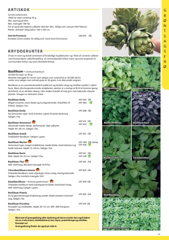 13Basilikum MarianBasilikum RosieBasilikum ThaiCitronbasilikumKRYDDERURTERARTISKOKCynara cardunculus1000 fr%u00f8 vejer omkring 50 g. Min. spiring p%u00e5 65%.Min. m%u00e6ngde 100 fr%u00f8.For at opn%u00e5 det h%u00f8jeste udbytte skal der s%u00e5es tidligt som i januar eller februar. Plante afstand i %u00e5rlig kultur 100 x 100 cm.Vert de ProvenceErstatter Green Globe. En tidlig sort, med store fine kroner. 226 645 OBVi har et stort og bredt sortiment af forskellige krydderurter og i flere af sorterne udf%u00f8rer vore leverand%u00f8rer v%u00e6kstfor%u00e6dling s%u00e5 sortsmaterialet bliver mere og mere anpasset til vore kunders behov og vores Nordiske klimat.Basilikum %u2013 Ocimum basilicum20 000 fr%u00f8 vejer ca 30 gr.Mindste m%u00e6ngde for sorter som s%u00e6lges som enhed fr%u00f8 er 50 000 (50 K),sorter som s%u00e6lges som enhed gram er 50 gram, hvis ikke andet angives.Basilikum er en varmekr%u00e6vende krydderurt og bedste smag og kvalitet opn%u00e5es i v%u00e6ksthuse. Mens drivhusproducerede sm%u00e5planter n%u00e6sten er umulige at f%u00e5 til at komme igang p%u00e5 friland, vil en direkte s%u00e5ning i den anden halvdel af maj give overraskende robuste planter. Smagen er ekstremt st%u00e6rk. Basilikum DollyMeget ensartet, store blade og hurtigvoksende. Anbefales til friland. S%u00e6lges i fr%u00f8.297 605 OB297 606PBasilikum EmilyNy Genoveser type. God resistens, egnet til potte dyrkning. S%u00e6lges i fr%u00f8.297 608 Basilikum GenoveserGlinsende m%u00f8rke blade, skeformede. H%u00f8jt udbytte. 297 613 297 614Basilikum Gr%u00e6skSm%u00e5bladet Basilikum. S%u00e6lges i gram.297 501 Basilikum MarianGenoveser type, meget middelstore m%u00f8rke blade. God tolerence og kulde tolerant. H%u00f8jde 15%u201320 cm. S%u00e6lges i fr%u00f8.297 508 amp297 636Basilikum RosieR%u00f8d. H%u00f8jde 20%u201325 cm. S%u00e6lges i fr%u00f8.297 631 OB297 529 PBasilikum Thai400%u2013600 fr%u00f8/g. Mindste m%u00e6ngde 50 K fr%u00f8.297 635 OBCitronbasilikum LemonaFinbladet Basilikum med udpr%u00e6get citron smag. Hurtigvoksende. S%u00e6lges i fr%u00f8, mindste m%u00e6ngde 10 K.297 624 OBKanelbasilikum %u2013 Ocimum gratissimumFinbladet basilikum med m%u00f8rkegr%u00f8nne blade med kanel smag. 400%u2013600 fr%u00f8/g. S%u00e6lges i gram.297 509 OBBasilikum PiamiaEn ny genoversertype til dyrkning i potter. St%u00e6rk resistens mod meldug. S%u00e6lges i fr%u00f8.297 629 OBBasilikum PiccolinoKompakt og sm%u00e5bladet. H%u00f8jde 20%u201325 cm. 600%u2013800 fr%u00f8/gram. S%u00e6lges i fr%u00f8.297 619 OBBasilikum DollyBasilikum GenoveserKlotbasilikum PiccolinoKanelbasilikumBlomster til gr%u00f8ng%u00f8dning eller dyrkning af st%u00f8rre arealer kan ogs%u00e5 k%u00f8bes via os. F.eks asters, klokkeblomst, h%u00f8r, lupin, pr%u00e6stekrage og solsikke.Kontakt os!Gr%u00f8ng%u00f8dning finder du ogs%u00e5 p%u00e5 side 6.