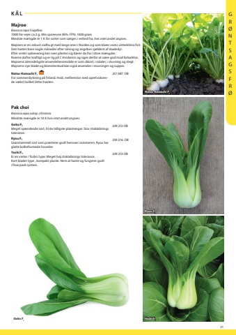 21Goku F1K%u00c5LMajroeBrassica rapa f.rapifera1000 fr%u00f8 vejer ca 2 g. Min spireevne 85%. FPN: 1000 gramMindste m%u00e6ngde er 1 K for sorter som s%u00e6lges i enhed fr%u00f8, hvis intet andet angives.Majroen er en robust rodfrugt med lange aner i Norden og som klarer vores vinterklima fint. Den h%u00f8stes bare nogle m%u00e5neder efter s%u00e5ning og angribes sj%u00e6ldent af skadedyr. Efter vinter opbevaring kan roen plantes og b%u00e6rer da fr%u00f8 i store m%u00e6ngder. Roerne dufter kraftigt og er rig p%u00e5 C Hvidamin og siges derfor at v%u00e6re god mod fork%u00f8lelse. Majroens almindeligste anvendelsesomr%u00e5de er som r%u00e5kost, i salater, i stuvning og stegt. Majroens nye blade og blomsterskud kan ogs%u00e5 anvendes i stuvninger og supper. Natsu-Komachi F1 For sommerdyrkning p%u00e5 friland. Hvid, mellemstor med opretvoksende v%u00e6kst hvilket letter h%u00f8sten.251 087 OBPak choiBrassica rapa subsp. chinensisMindste m%u00e6ngde er 10 K hvis intet andet angives.Goku F%u2081Meget sp%u00e6ndende sort, til de tidligste plantninger. Stor stokl%u00f8bnings tolerance.239 212 Ryou F%u2081Gr%u00f8nstammet sort som pr%u00e6sterer godt henover sommeren. Ryou har glatte kolbeformede hoveder.239 216 Yoshi F%u2081 Er en vinter / for%u00e5rs type. Meget h%u00f8j stokl%u00f8bnings tolerance. Kort bladet type , kompakt plante. Nem at h%u00f8ste og fungerer godt i flow pack system.239 213 Yoshi F1Natsu-Komachi F