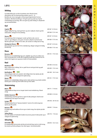 23Red RadientCupidoRuby StarLongorStikl%u00f8gForudbestilling for at sikre kvantiteter sker efter%u00e5r/vinter. Afsendelse sker fra Hammenh%u00f6g mellem uge 10 %u2013 13.Bestilles der store m%u00e6ngder vil levering foreg%u00e5 direkte fra leverand%u00f8ren. Mindste bestilling er 10 kg for gule og r%u00f8de og 5 kg for schalottel%u00f8g og silverl%u00f8g. Alle vore gule og r%u00f8de stikl%u00f8g er ubejdsede og varmebehandlet.GulCupido Meget tidlig flot l%u00f8g, med god form og stort udbytte. St%u00e6rk og flot skalkvalitet. Velegnet til bundtel%u00f8g.249 567 8-14 mm249 568 17-21 mmSturonEn krydsning af de to l%u00f8gtyper runde og flad runde, som er cirka en uge tidligere, men giver et lavere udbytte end helrunde Rijnsburgertyper. God sort for dem, der %u00f8nsker en tidlig h%u00f8st af l%u00f8g.249 427 8-14 mm249 428 17-21 mmStuttgarter RiesenNem at dyrke og stort set fri for stokl%u00f8bning. Meget velegnet til tidlig bundtning.249 407 8-12 mm249 408 17-21 mmRosaRosanna Rosanna er et middeltidigt l%u00f8g som udskiller sig ved sin unikke rosa farve og producerer runde eller kuppelformede l%u00f8g. Rosanna har en relativ kort lagerevne og passer bedst til friskmarkedet.249 413 17-21 mmR%u00f8dRed Baron R%u00f8d, mellemstort stikl%u00f8g. Det er godt farvet med god skal og god opbevaring evne.249 498 8-12 mm249 499 17-21 mmRed Radient Vores tidligste r%u00f8de sort, plantet i det tidlige for%u00e5r. Kan dyrkes p%u00e5 alle jordtype men er ikke velegnet til opbevaring.249 409 14-21 mmKamal Kamal er et middeltidligt stikl%u00f8g med en dyb r%u00f8d farve og st%u00e6rke r%u00f8dder. Kamal giver runde l%u00f8g med st%u00e6rk skal og smal nakke.249 412 17-21 mmSkalottel%u00f8g BiztroTidlig R%u00f8dbrunt l%u00f8g som er meget st%u00e6rk imod stokl%u00f8bning. Pikant smag.249 711 7-14 mm Golden GourmetSchalottel%u00f8g med flot gul farve, egnet til alle jordtyper. St%u00e6rk mod stokl%u00f8bning. Kan lagres kortvarigt.249 080 8-12 mmLongorAflangt kobberfarvet %u201dbananschalotte%u201d med en fin mild smag kan dyrkes p%u00e5 alle jorder.298 346 20-45 mmRed SunEt tidligt l%u00f8g med r%u00f8dbrun farve og en st%u00e6rk smag. Kan dyrkes p%u00e5 alle jorder.249 091 7-14 mmYellow Moon Kan ofte kaldes en forbedret Golden Gourmet, passer til alle jorder og er velegnet til opbevaring.249 710 7-14 mmSilverl%u00f8g Snow Ball Et middeltidligt skinnende s%u00f8lvfarvet/snehvidt l%u00f8g med en mild smag. Kan dyrkes p%u00e5 alle jordtyper. Kan ikke lagres. Varmebehandlet249 070 14-21 mmL%u00d8GYHE