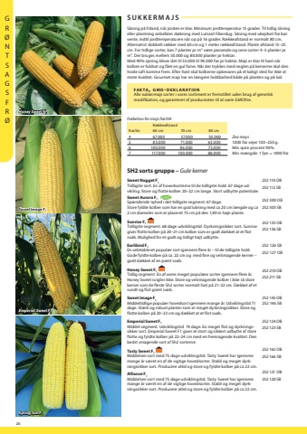 26GR%u00d8NTSAGSFR%u00d8Sweet Image FHoney Sweet FEmperial Sweet FSpring Sun FSUKKERMAJSfa k ta, g m o-d e k l a r at i o nAlle sukkermajs sorter i vores sortiment er fremstillet uden brug af genetisk modifikation, og garanteret af producenten til at v%u00e6re GMOfrie.S%u00e5ning p%u00e5 friland, n%u00e5r jorden er klar. Minimum jordtemperatur 15 grader. Til tidlig s%u00e5ning eller plantning anbefales d%u00e6kning med Lutrasil Fiberdug. S%u00e5ning med ubejdset fr%u00f8 b%u00f8r vente, indtil jordtemperaturen n%u00e5r op p%u00e5 16 grader. R%u00e6kkeafstand er normalt 80 cm. Alternativt dobbelt r%u00e6kker med 60 cm og 1 meter r%u00e6kkeafstand. Plante afstand 15%u201325 cm. For tidlige sorter, kan 7 planter pr m2 v%u00e6re passende og sene sorter 4%u20135 planter pr m2. Der bruges mellem 50.000 og 80.000 planter pr hektar. Med 90% spiring bliver det til 55.000 til 90.000 fr%u00f8 pr hektar. Majs er klar til h%u00f8st n%u00e5r kolben er fuldsat og f%u00e5et en gul farve. N%u00e5r der trykkes med neglen p%u00e5 kernerne skal den hvide saft komme frem. Efter h%u00f8st skal kolberne opbevares p%u00e5 et k%u00f8ligt sted for ikke at miste kvalitet. Gourmet majs har en l%u00e6ngere holdbarhed b%u00e5de p%u00e5 planten og p%u00e5 k%u00f8l.SH2 sorts gruppe %u2013 Gule kernerSweet Nugget F1Tidligste sort. En af hovedsorterne til de tidligste hold. 67 dage udvikling. Store og flotte kolber 20%u201322 cm lange. Stort udbytte potentiale.252 110 252 112 Sweet Aurora F1Sp%u00e6ndende nyhed i det tidligste segment. 67 dage. Store fyldte kolber som har en god lukning med ca 20 cm l%u00e6ngde og ca 2 cm diameter som er placeret 75 cm p%u00e5 den 1,90 m h%u00f8je plante.252 300 252 303 Sunrise F1Tidligste segment. 68 dage udviklingstid. Dyrkningssikker sort. Sunrise sv%u00f8b. Mulighed for et godt og tidligt h%u00f8jt udbytte.252 135 Earlibird F1 En veletableret popul%u00e6r sort igennem flere %u00e5r %u2013 til de tidligste hold. Gode fyldte kolber p%u00e5 ca. 22 cm og med fine og velsmagende kerner %u2013 godt d%u00e6kket af en p%u00e6nt sv%u00f8b.252 126 SB252 127 OBHoney Sweet F1Tidlig segment. En af vores meget popul%u00e6re sorter igennem flere %u00e5r. Honey Sweet svigter ikke. Store og velsmagende kolber ( ikke s%u00e5 store kerner som de fleste Sh2 sorter normalt har) p%u00e5 21%u201322 cm. D%u00e6kket af et sundt og flot gr%u00f8nt sv%u00f8b.252 210 252 211 Sweet Image F1Middeltidlige popul%u00e6r hovedsort igennem mange %u00e5r. Udviklingstid 71 dage. St%u00e6rk og robust planter som er meget dyrkningssikker. Store og flotte kolber p%u00e5 20%u201322 cm og d%u00e6kket at et flot sv%u00f8b.252 145 252 146 SBEmperial Sweet F1Middel segment. Udviklingstid 74 dage. En meget flot og dyrkningssikker sort. Emperial Sweet F1 giver et stort og sikkert udbytte af store flotte og fyldte kolber p%u00e5 22%u201324 cm med en fremragende kvalitet. Den bedst smagende sort af Sh2 sorterne.252 124 252 123 Tasty Sweet F1 Middelsen sort med 75 dage udviklingstid. Tasty Sweet har igennme mange %u00e5r v%u00e6ret en af de vigtige hovedsorter. Stabil og meget dyrkningssikker sort. Producere altid og store og fyldte kolber p%u00e5 ca 22 cm.252 165 252 166 Alliance F1Middelsen sort med 75 dage udviklingstid. Tasty Sweet har igennme mange %u00e5r v%u00e6ret en af de vigtige hovedsorter. Stabil og meget dyrkningssikker sort. Producere altid og store og fyldte kolber p%u00e5 ca 22 cm.252 121 OB252 120 Fr%u00f8behov for majs fr%u00f8/HAR%u00e6kkeafstandFr%u00f8/lm60 cm70 cm80 cm467.00057.00050.000583.00071.00063.0006100.00086.00075.0007117.000100.00088.000Zea mays1000 fr%u00f8 vejer 100%u2013250 g. Min spire procent 90%. Min m%u00e6ngde: 1 fpn = 1000 fr%u00f8NYHED
