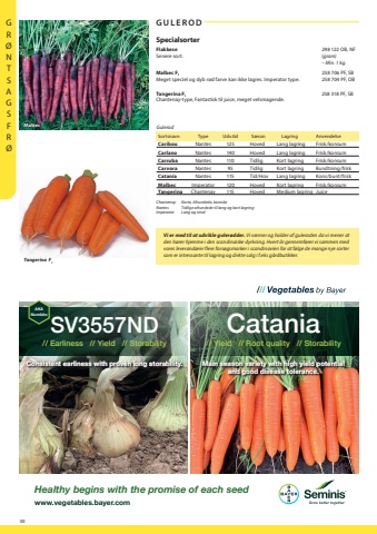 30GR%u00d8NTSAGSFR%u00d8GulerodSortsnavnTypeUdv.tid S%u00e6son LagringAnvendelseCaribouNantes125HovedLang lagringFrisk/konsumCarlanoNantes140HovedLang lagringFrisk/konsumCarrubaNantes110TidligKort lagringFrisk/konsumCarvoraNantes95TidligKort lagringBundtning/friskCataniaNantes115Tid/HovLang lagringKons/bunt/friskMalbec Imperator120HovedKort lagringFrisk/konsumTangerinaChantenay115HovedMedium lagringJuiceChantenayKorte, Afrundede, koniske NantesTidlige afrundede til lang og kort lagring ImperatorLang og smalGULERODSpecialsorterFlakkeseSenere sort. 298 122 OB, NF (gram)%u2013 Min. 1 kg.Malbec F1Meget speciel og dyb r%u00f8d farve kan ikke lagres. Imperator type.258 706 PF, SB258 704 PF, OBTangerina F1Chantenay-type, Fantastisk til juice, meget velsmagende.258 318 PF, SBVi er med til at udvikle guler%u00f8dder. Vi v%u00e6rner og holder af guleroden da vi mener at den h%u00f8rer hjemme i den scandinaiske dyrkning. Hvert %u00e5r gennemf%u00f8rer vi sammen med vores leverand%u00f8rer flere fors%u00f8gsmarker i scandinavien for at f%u00f8lge de mange nye sorter som er intressante til lagring og dirkte salg i f.eks g%u00e5rdbutikker. Tangerina F1MalbecHealthy begins with the promise of each seedwww.vegetables.bayer.comSV3557NDCataniaConsistent earliness with proven long storability.// Earliness // Yield // Storability// Yield // Root quality // StorabilityMain season variety with high yield potentialand good disease tolerance.Consistent earliness with proven long storability.AKANumbito
