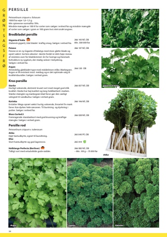 34GR%u00d8NTSAGSFR%u00d8ArgonStarkePERSILLEPetroselinum crispum v. foliosum1000 fr%u00f8 vejer 1,0%u20131,5 g. Min spireevne normalfr%u00f8 70%.Mindste m%u00e6ngde er 100 K for sorter som s%u00e6lges i enhed fr%u00f8 og mindste m%u00e6ngde af sorter som s%u00e6lges i gram er 100 gram hvis intet andet angives.Bredbladet persilleGigante d%u2019Italia (Italiensk gigant), Glat bladet kraftig smag. S%u00e6lges i enhed fr%u00f8.266 143 NF, OBMin. 500 000 fr%u00f8PeionePeione er en ny Gigante d%u2019Italiatyp med store glatte blade og opret v%u00e6kst. Sortens absolut st%u00f8rste fordel er dets h%u00f8je niveau af resistens over for bladskimmel. En for Sverige og Danmark forholdsvis ny sygdom, der stadig vokser i betydning. S%u00e6lges i enhed fr%u00f8. 266 147 NF, OBArgonAlmindelig glatbladet type med middelstore stilke. M%u00f8rkegr%u00f8n. Argon er IR-resistent mod meldug og er det optimale valg til kvalitetsbundter. S%u00e6lges i enhed gram.266 120 OBKrus persilleStarkeHurtigt voksende, ekstremt kruset sort med meget god stilk kvalitet. Starke har h%u00f8j kvalitet og lang holdbarhed i marken. St%u00e6rke st%u00e6ngler og m%u00f8rkegr%u00f8n blad farve g%u00f8r den s%u00e6rligt velegnet til vandkultur. S%u00e6lges i enhed gram.266 057 NF, OBKatinkaErstatter Wega opr%u00e6t v%u00e6kst hurtig voksende, Ensartet fin m%u00f8rk farve. Kan dyrkes hele s%u00e6sonen. Til buntning og dyrkning i potter. S%u00e6lges i enhed fr%u00f8.266 146 Moss Curled 2 Fremragende standardsort med god krusning og kraftige st%u00e6ngler. S%u00e6lges i enhed gram.266 020 Persille rodPetroselinum crispum v. tuberosum AtikaH%u00f8jt h%u00f8studbytte, egnet til bundtning.265 045 EfezStort h%u00f8studbytte og god lagerevne.265 014 Halblange Perfecta (Berliner) Tidligt sort med veludviklde gode r%u00f8dder.266 082 Min. 100 g PeioneGigante d%u2019Italia