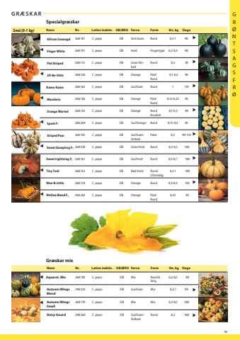 39GR%u00c6SKARSpecialgr%u00e6skarSm%u00e5 (0-1 kg)NavnNr.Latins indeln.OB/%u00d8KOFarveFormStr, kgDage African Smaragd 268 181C. pepoOBSort/Gr%u00f8nRund0,5-190t Finger White 268 191C. pepoOBHvidFingertype0,2-0,490 Flat Striped 268 115C. pepoOBGr%u00f8n/StribedRund0,585t Jill-Be-little 268 126C. pepoOBOrangeFlad/Rund0,1-0,290Kamo-Kamo 268 165C. pepoOBGul/Gr%u00f8nRund1110t Mandarin 268 102C. pepoOBOrangeFlad/Rund0,15-0,25 95 Orange Warted 268 135C. pepoOBOrangeRund Knudret0,1-0,390t Spark F1268 204C. pepoOBGul/OrangeRund0,15-0,385 Striped Pear 268 105C. pepoOBGul/Gr%u00f8n/StribedP%u00e6re0,2 90-110tSweet Dumpling F1268 520C. pepoOBGr%u00f8n/HvidRund0,3-0,5100Sweet Lightning F1268 161C. pepoOBGul/HvidRund0,5-0,7100tTiny Turk 268 152C. pepoOBR%u00f8d/HvidRund/UformeligWee-B-Little 268 124C. pepoOBOrange0,2-0,4tWeOne Blend F1268 263C. pepoOBOrangeFlad/Rund95Gr%u00e6skar mix NavnNr.Latins indeln.OB/%u00d8KOFarveFormStr, kgDagetAquarel, Mix 268 192C. pepoOBMixRund & lang0,2-0,590Autumn Wings Blend 298 210C. pepoOBGul/Gr%u00f8nMix0,2-1 95tAutumn Wings Small 268 170C. pepoOBMixMix0,2-0,5100Daisy Gourd 298 263C. pepoOBGul/Gr%u00f8n/StribedRund0,2 100
