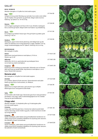 47SALATm i n ir o m a i nMindste m%u00e6ngde er 5 K piller hvis intet andet angives.Hajo NYHEDVelegnet til brug under fiberdug og i perioder, hvor andre sorter skiller sig ud i h%u00f8jden. Flot gul hjerte og god finish. Meget st%u00e6rk mod stokl%u00f8bning og Tipburn Ca. 16-18 cm h%u00f8j.277 916 Hannes NYHEDLidt hurtigere og l%u00e6ngere end Xuan (18-22 cm). Attraktiv m%u00f8rkegr%u00f8n farve, med flot gul hjerte. Meget st%u00e6rk mod Tipburn og stokl%u00f8bning.277 918 Harro NYHEDEn hurtigere og m%u00f8rkere Xoana-type. Flot gult hjerte og lukker godt. Omkring 17-20 cm.277 917 Xanbera NYHEDM%u00f8rkegr%u00f8n, egnet til den f%u00f8rste plantning i det tidlige for%u00e5r og den sidste om efter%u00e5ret, hvor hurtig plantning er vigtig. Halv%u00e5ben sort og meget modstandsdygtig over for Tipburn. Omkring 18-22 cm h%u00f8j.277 919 m i d i r o m a i nMin m%u00e6ngde 5 K piller.AirtonMidiromain med god tolerence mod tipburn, 27-30 cm. Plantes uge 15-30.277 925 AdicampMellenstor, 30-35 cm, opretvoksende og m%u00f8rkegr%u00f8n farve. Let at h%u00f8ste og st%u00e6rk mod tipburn.277 780 Cospenza Krydsning mellen iceberg og romainsalat. Udseende som en Romain. Med s%u00f8d smag og spr%u00f8de blade. H%u00f8j tolerence mod tipburn. Let at h%u00f8ste. Plantes hele s%u00e6sonen.277 284 Batavia salatMin m%u00e6ngde er 10 K piller hvis intet andet opgives.AveledaEn ny Melina. Batavia til hele s%u00e6sonen. Opretvoksende med tykke blade og m%u00f8rk farve. Fuld resistens, str. Medium. 277 252 Gylona NYHEDGylona har en meget st%u00e6rk base, god volumen og er velfyldt. Mellemgr%u00f8n farve med gode krusede blade.277 020 Tafta NYHEDEn flot kr%u00f8llet Lollo Verde-type. Skinnende gr%u00f8n farve med god tekstur p%u00e5 bladene. God v%u00e6gt, st%u00e6rk modstandsdygtighed over for stokl%u00f8bning og har god holdbarhed. 277 921 Crispy salatMindste m%u00e6ngde 1 K ubejdsede piller og 5 K %u00f8kologiske piller hvis intet andet angives.CrisminaCrispy salat med frisk gr%u00f8n farve. Crismina har tykke krusede blade med en s%u00f8d smag. Sorten holder sig godt, er st%u00e6rk mod brune render og hurtigvoksende.277 878 Crispinet Spr%u00f8d middelgr%u00f8n, tykke blade med god holdbarhed. Kombinerer en s%u00f8dlig smag med fin spr%u00f8dhed. Middelstor for dyrkning hele s%u00e6sonen. Kan p%u00e5virkes af st%u00e6rk sommerhede.277 877 Cristabel Spr%u00f8d middelgr%u00f8n, tykke blade med god holdbarhed. Kombinerer en s%u00f8dlig smag med fin spr%u00f8dhed. Middelstor for dyrkning hele s%u00e6sonen. Kan p%u00e5virkes af st%u00e6rk sommerhede.277 894 HajoGylonaTaftaHannes