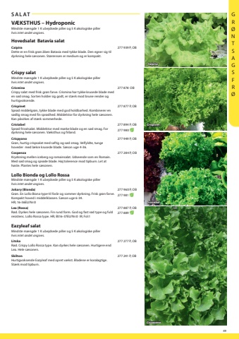 49CaipiraCrispinetCrispyanoSALATV%u00c6KSTHUS %u2013 HydroponicMindste m%u00e6ngde 1 K ubejdsede piller og 5 K %u00f8kologiske piller hvis intet andet angives.Hovedsalat Batavia salatCaipiraDette er en frisk gr%u00f8n %u00e5ben Batavia med tykke blade. Den egner sig til dyrkning hele s%u00e6sonen. St%u00f8rrensen er medium og er kompakt.277 939 Crispy salatMindste m%u00e6ngde 1 K ubejdsede piller og 5 K %u00f8kologiske piller hvis intet andet angives.CrisminaCrispy salat med frisk gr%u00f8n farve. Crismina har tykke krusede blade med en s%u00f8d smag. Sorten holder sig godt, er st%u00e6rk mod brune render og hurtigvoksende.277 878 CrispinetSpr%u00f8d middelgr%u00f8n, tykke blade med god holdbarhed. Kombinerer en s%u00f8dlig smag med fin spr%u00f8dhed. Middelstor for dyrkning hele s%u00e6sonen. Kan p%u00e5virkes af st%u00e6rk sommerhede.277 877 CristabelSpr%u00f8d friss%u00e9salat. Middelstor med m%u00f8rke blade og en s%u00f8d smag. For dyrkning hele s%u00e6sonen. V%u00e6ksthus og friland. 277 894 277 980CrispyanoGr%u00f8n, hurtig crispsalat med saftig og s%u00f8d smag. Velfyldte, tunge hoveder med l%u00e6kre krusede blade. S%u00e6son uge 4-36.277 949 CospenzaKrydsning mellen iceberg og romainsalat. Udseende som en Romain. Med s%u00f8d smag og spr%u00f8de blade. H%u00f8j tolerence mod tipburn. Let at h%u00f8ste. Plantes hele s%u00e6sonen.277 284 Lollo Bionda og Lollo Rossahvis intet andet angives.Jokary (Bionda)Gr%u00f8n. En Lollo Biona type til for%u00e5r og sommer dyrkning. Frisk gr%u00f8n farve. Kompakt hoved i middelklassen. S%u00e6son uge 6-34.HR; 16-36EU/Nr:0277 981Lea (Rossa)R%u00f8d. Dyrkes hele s%u00e6sonen. Fin rund form. God og fast r%u00f8d type og fuld resistens. Lollo Rossa type. HR; Bl:16-37EU/Nr:0 IR; Fol:1277 887 277 889Eazyleaf salatMindste m%u00e6ngde 1 K ubejdsede piller og 5 K %u00f8kologiske piller hvis intet andet angives.LitskaR%u00f8d. Crispy Lollo Rossa type. Kan dyrkes hele s%u00e6sonen. Hurtigere end Lea. Hele s%u00e6sonen. 277 277 SkiltonHurtigvoksende Eazyleaf med opret v%u00e6kst. Bladene er koralagtige. St%u00e6rk mod tipburn.277 241