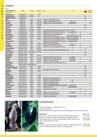60GR%u00d8NTSAGSFR%u00d8TOMATTomatProff SortimentTypeFarveV%u00e6gt, gHRIRT F%u00e5s somSortsnavn%u00f8kofr%u00f8Balconi redAmpeltomatR%u00f8d15-20Tumbling TomAmpeltomatR%u00f8d/Gul25JAWandering TomAmpeltomatJABelleB%u00f8ftomatR%u00f8d170-210TOMV:0-2/Va:0/Vd:0/Fol:0,1JABronskiB%u00f8ftomatR%u00f8d140-160ToMV:0-2/ToBRFV/Ff:A-E/Fol:0,1TSWV/OnForenzaB%u00f8ftomatR%u00f8d170-200ToMV:0-2/Ff:A-E/Va:0/Vd:07Fol:0,1On/Ma/Mi/MjMarmandeB%u00f8ftomatR%u00f8d160-180JATiny TimBusktomatR%u00f8d20-30JATotemBusktomatR%u00f8d50-70JAAnnadarkCocktailtomatBrun/R%u00f8d35-40ToMv:0-2/ToANV/Ff:A-E/Va:0/Vd:0/Fol:0,1/ForTSWVAnna%u00efsaCocktailtomatR%u00f8d35-45ToMV:0-2/Ff:A-E/Va:0/Vd:0/Fol:0,1/ForOn/Ma/Mi/MjSiAnnamayCocktailtomatR%u00f8d35-40ToMV:0-2/Ff:A-E/va:0/Vd:0/Fol:0,1OnSiAnnaorangeCocktailtomatOrange35-40ToMv:0-2/Ff:A-E/Fol:0,1/ForTSWV/On/Ma/Mi/MjSiAnnarozayCocktailtomatRosa35-40ToMv:0-2/Ff:A-E/Va:0/Vd:0/Fol:0,1/ForTSWV/On/Ma/Mi/MjSiAnnasunCocktailtomatGul35-40ToMv:0-2/Ff:A-E/Va:0/Vd:0/Fol:0,1/ForTSWV/On/Ma/Mi/MjAnnico CoveCocktailtomatR%u00f8dToMV:0-2/ToANV/ToBRFV/Pf:A-E/Fol:0,1TSWV/Ma/Mi/MjArancaCocktailtomatR%u00f8d30-35ToMV/Ff:A-E/Va/Vd/Fol:0,1CampariCocktailtomatR%u00f8d45-50ToMV:0-2/VA:0/Vd:0/Fol:0,1/ForMA/Mi/MjSiAvalantinoKlassiske rundeR%u00f8d60-70ToMV:0-2/Ff:A-E/Va:0/Vd:0/Fol:0,1/ForOnSiDansk ExportKlassiske rundeR%u00f8d90-100JACarolezaKlassiske rundeR%u00f8d65-105ToMV:0-2/TONV/Ff:A-E/Va:0/VD:0/Fol:0,1/ForOnSiGreen ZebraKlassiske rundeGr%u00f8nstribet100-150JAHartzfeuerKlassiske rundeR%u00f8dJA Potentat IIKlassiske rundeR%u00f8d95-105JARhodiumKlassiske rundeR%u00f8d110-115ToMV:0-2/ToBRFV/Ff:A-E/Fol:0,10n/ TSWUSjalezaKlassiske rundeR%u00f8d105-110ToMV:0-2/Ff:A-E/Va:0/Fol:0,1ForTSWV/OnSiSpartaKlassiske rundeR%u00f8d100-110ToMV/Ff:A-E/Va/Vd/Fol:0,1Ma/Mi/MjTemptationKlassiske rundeR%u00f8d60-70ToMV:0-2/Ff:A-E/Va:0/Vd:0/Fol:0,1/ForSiTigerellaKlassiske rundeGul/Orange/R%u00f8dBlack CherryCherrytomatBrun15-20Gardener%u00b4s DelightCherrytomatR%u00f8d18-22HanamiCherrytomat18-24HR: ToMV:0-2/Ff:A-E/Fol:0,1MirabellCherrytomat10-12SakuraCherrytomatSnowberryCherrytomat15-20SupersweetCherrytomatR%u00f8d15-20TomagellowCherrytomatGul10-22ToMV:0-2/Va:0/Vd:0/Fol:0/ForTomaginoCherrytomatR%u00f8d20-22ToMV:0-2/va:0/Vd:0/Fol:0/ForTomarangeCherrytomatOrange18-22ToMV:0-2/ToANV/Fol:0/ForArdilesBlommetomatR%u00f8d35-40ToMV:0-2/Va:0/Vd:o/Fol:0,1Ardiles ReinaBlommetomatR%u00f8d40-45ToMv:0-2/ToANV/ToBRFV/Pf:A-E/Va:0/Vd:0/Fol:0,10n/Ma/Mi/MjGarnichaBlommetomatR%u00f8d11-12ToMV:0-2/Fol:0,1TSW/Ma/Mi/MjGustafanoBlommetomatR%u00f8d20-25ToMV:0-2/Ff:A-E/Fol:0,1SiRomaBlommetomatR%u00f8d90-100JASavantasBlommetomatR%u00f8d90-100ToMV:0-27Ff:A-E/Fol:0,1/ForMa/Mi/MjSiPozzanoSan MarzanoR%u00f8d135-145ToMv:0-2/Va:0/Vd:0/Fol:0,1JAVesuviusSan MarzanoR%u00f8d35-40ToMV:0-2/VA/Vd/Fol:0,1On/Ma/Mi/MjBlack Pearl F1Mirka F1Solanum melongena L %u2013 1000 fr%u00f8 vejer ca 5 g. Min spireprocent 80 %.Mindste m%u00e6ngde er 50 ubejdsede fr%u00f8 og 100 %u00f8kologiske fr%u00f8 hvis intet andet angivesBlack Pearl F1Denne sort er meget produktiv og giver et stabilt udbytte i l%u00f8bet af for%u00e5ret og sommeren. Frugterne er halvlange, ensartede og har en meget m%u00f8rk purpur farve. Black Purple dyrkes prim%u00e6rt i drivhus, men ogs%u00e5 tunnel produktion er mulig.292 051 Min. 50292 050 %u2013Min. 100Mirka F1Mirka er en st%u00e6rk sort, der kan h%u00e5ndtere varierende v%u00e6kstbetingelser p%u00e5 grund af sit st%u00e6rke rodsystem. Frugterne er lange og lilla.292 056 Min. 100AUBERGINE