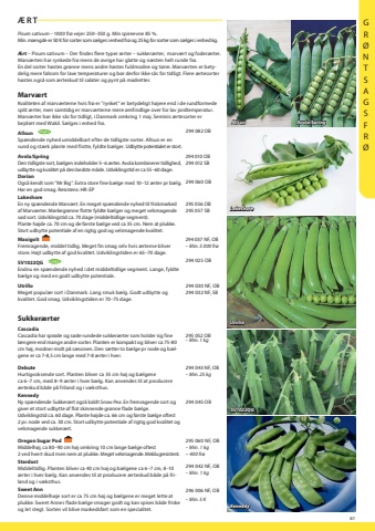 61%u00c6RTPisum sativum %u2013 1000 fr%u00f8 vejer 250%u2013350 g. Min spireevne 85 %. Min. m%u00e6ngde er 50 K for sorter som s%u00e6lges i enhed fr%u00f8 og 25 kg for sorter som s%u00e6lges i enhed kg.%u00c6rt %u2013 Pisum sativum %u2013 Der findes flere typer %u00e6rter %u2013 sukker%u00e6rter, marv%u00e6rt og foder%u00e6rter. Marv%u00e6rten har rynkede fr%u00f8 mens de %u00f8vrige har glatte og n%u00e6sten helt runde fr%u00f8. En del sorter h%u00f8stes gr%u00f8nne mens andre h%u00f8stes fuldmodne og t%u00f8rre. Marv%u00e6rten er betydelig mere f%u00f8lsom for lave temperaturer og b%u00f8r derfor ikke s%u00e5s for tidligt. Flere %u00e6rtesorter h%u00f8stes ogs%u00e5 som %u00e6rteskud til salater og pynt p%u00e5 madretter. Marv%u00e6rtKvaliteten af marv%u00e6rterne hvis fr%u00f8 er %u201drynket%u201d er betydeligt h%u00f8jere end i de rundformedesplit %u00e6rter, men samtidig er marv%u00e6rterne mere %u00f8mfindlige over for lav jordtemperatur. Marv%u00e6rter b%u00f8r ikke s%u00e5s for tidligt, i Danmark omkring 1 maj. Seminis %u00e6rtesorter er bejdset med Wakil. S%u00e6lges i enhed fr%u00f8.Allsun NYHEDSp%u00e6ndende nyhed umiddelbart efter de tidligste sorter. Allsun er en sund og st%u00e6rk plante med flotte, fyldte b%u00e6lger. Udbytte potentialet er stort.294 082 Avola/SpringDen tidligste sort, b%u00e6lgen indeholder 5%u20136 %u00e6rter. Avola kombinerer tidlighed, udbytte og kvalitet p%u00e5 den bedste m%u00e5de. Udviklingstid er ca 55%u201360 dage.294 010 OB 294 012 SBDorian Ogs%u00e5 kendt som %u201dMr Big%u201d. Extra store fine b%u00e6lge med 10%u201312 %u00e6rter pr b%u00e6lg. Har en god smag. Resistens: HR: EP294 060 LakeshoreEn ny sp%u00e6ndende Marv%u00e6rt. En meget sp%u00e6ndende nyhed til friskmarked af Marv%u00e6rter. M%u00f8rkegr%u00f8nne flotte fyldte b%u00e6lger og meget velsmagende s%u00f8d sort. Udviklingstid ca. 70 dage (middeltidlige segment). Plante h%u00f8jde ca. 70 cm og de f%u00f8rste b%u00e6lge ved ca 35 cm. Nem at plukke. Stort udbytte potentiale af en rigtig god og velsmagende kvalitet.295 056 295 057 SBMaxigolt Fremragende, middel tidlig. Meget fin smag selv hvis %u00e6rterne bliver store. H%u00f8jt udbytte af god kvalitet. Udviklingstiden er 65%u201370 dage.294 037 NF, OB%u2013 Min. 5 000SV1022QG NYHEDEndnu en sp%u00e6ndende nyhed i det middeltidlige segment. Lange, fyldte b%u00e6lge og med en godt udbytte potentiale.294 025 OBUtrillo Meget popul%u00e6r sort i Danmark. Lang smuk b%u00e6lg. Godt udbytte og kvalitet. God smag. Udviklingstiden er 70%u201375 dage. 294 030 NF, OB294 032 NF, SBSukker%u00e6rterCascadia Cascadia har spr%u00f8de og s%u00f8de rundede sukker%u00e6rter som holder sig fine l%u00e6ngere end mange andre sorter. Planten er kompakt og bliver ca 75-80 cm h%u00f8j, modner midt p%u00e5 s%u00e6sonen. Den s%u00e6tter to b%u00e6lge pr node og b%u00e6lgene er ca 7-8,5 cm lange med 7-8 %u00e6rter i hver. 295 052 OB%u2013 Min. 1 kgDebute Hurtigvoksende sort. Planten bliver ca 35 cm h%u00f8j og b%u00e6lgene ca 6%u20137 cm, med 8%u20139 %u00e6rter i hver b%u00e6lg. Kan anvendes til at producere %u00e6rteskud b%u00e5de p%u00e5 friland og i v%u00e6ksthus. 294 043 OB%u2013 Min. 25 kgKennedyNy sp%u00e6ndende Sukker%u00e6rt ogs%u00e5 kaldt Snow Pea. En fremragende sort og giver et stort udbytte af flot skinnende gr%u00f8nne flade b%u00e6lge.Udviklingstid ca. 60 dage. Plante h%u00f8jde ca. 66 cm og f%u00f8rste b%u00e6lge oftest 2 pr. node ved ca. 30 cm. Stort udbytte potentiale af rigtig god kvalitet og velsmagende sukker%u00e6rt.294 045 Oregon Sugar Pod Middelh%u00f8j, ca 80%u201390 cm h%u00f8j omkring 10 cm lange b%u00e6lge oftest 2 ved hvert skud men nem at plukke. Meget velsmagende. Meldugresistent.295 060 NF, OB%u2013 Min. 1 kg%u223c 400 fr%u00f8Stardust Middeltidlig. Planten bliver ca 40 cm h%u00f8j og b%u00e6lgene ca 6%u20137 cm, 8%u201310 %u00e6rter i hver b%u00e6lg. Kan anvendes til at producere %u00e6rteskud b%u00e5de p%u00e5 friland og i v%u00e6ksthus.294 042 NF, OB Min. 1 kgSweet Ann Denne middelh%u00f8je sort er ca 75 cm h%u00f8j og b%u00e6lgene er meget lette at plukke. Sweet Annes flade b%u00e6lge smager godt og kan spises b%u00e5de friske og let stegt. Sorten vil blive markedsf%u00f8rt som en specialitet.296 006 NF, OB%u2013 Min. 5 KAllsunAvola/SpringLakeshoreKennedySV1022QG