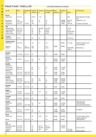 64GR%u00d8NTSAGSFR%u00d8Art sortS%u00e5tidUdviklings-R%u00e6kkeaf-Antal fr%u00f8/Antal planter/Antal Fr%u00f8behovAnm%u00e6rkningertidstand cmmm r%u00e6kkeplanter/hahakg/haB%u00f8nnerValsk b%u00f8nne1/4%u201331/550%u2013707%u2013107200Kan forkultiveres for tidlig h%u00f8stBrun b%u00f8nne15/51210200 000100%u2013120S%u00e5dybden 5%u20137 cmBusk b%u00f8nne15/5%u201320/61512240 00050%u201375Stang b%u00f8nne15/2%u20131/57/3%u20138/52,525 000100%u2013150To planter i hver potteDildBladdild friland15/3%u20131/8200%u2013400150%u201330010%u201320Sk%u00e6rmdild friland20/5%u201310/68040%u2013506%u201310Koldhus for%u00e5r1/2%u201331/310070%u2013800,2 kg/100 m2Koldhus Efter%u00e5r1/8%u20135/90,15 kg/m2FennikelDirekte s%u00e5et1/5%u20131/72,0%u20132,5 kgUdend%u00f8rs AgurkDirekte s%u00e5et15/3%u201331/540 0001,5%u20132 kgFordel at s%u00e5/plante under Lutrasil fiberdugPlantning1/515/540 00050 000Koldhus1/4-10/520/4-30/62500%u20133000/B%u00f8r bindes op1000 Blomk%u00e5lPlantet15/1%u201330/61/4%u201331/742 00050 000BroccoliDirekte s%u00e5et1/4%u201310/760 000200 000Plantet1/5%u201331/7 60 00070 000HvidK%u00e5lDirekte Sm%u00e5 hoveder 20/4%u201315/555 000110 000 Store hoveder 20/4%u201315/533 00067 000PlantningSm%u00e5 hoveder 15/2%u201315/420/4%u201315/555 000Store hoveder 15/2%u201315/420/4%u201315/533 00040 000Gr%u00f8nk%u00e5lIndustrial20/4%u201320/7400 000600 000Friske vare s%u00e5et20/4%u201310/642 000120 000Frisk vare plantet1/3%u201310/620/4%u201310/742 00050 000Rosenk%u00e5lPlantet1/2%u201310/41/4%u201315/53570040 000R%u00f8dk%u00e5lDirekte s%u00e5et1/4%u201330/442 000120 000Plantet1/3%u201310/415/4%u201315/542 00050 000Savoyk%u00e5lPlantet1/3%u201310/515/4%u20131/642 00050 000Kinak%u00e5lTidlig s%u00e5et underDirekte s%u00e5et15/6%u20135/860 000160 000Lutrasil fiberdugPlantet20/3%u201325/715/4%u201310/860 00070 000Varmebehandlede planterK%u00e5lrabiV%u00e6ksthus1/2%u201331/31/3%u201330/416 00020 000Per 1000 m2Direkte s%u00e5et15/4%u201310/7100 000200 000k%u00e5lroeDirekte s%u00e5et 15/4%u20131/68%u2013105%u2013680 000200 000For st%u00f8rre r%u00f8dder, reducerantallet af planter/mPlantet10/3%u201315/415/4%u201315/55%u2013680 00090 000Tidligt dyrkningL%u00f8gKepa L%u00f8g Direkte s%u00e5et, r%u00e6kke15/3%u201330/430%u20133528%u201332700 000Syltede l%u00f8g15/4%u201315/5400%u2013500300%u20134001,2 miljS%u00e5 i 65 mm bedFor%u00e5rsl%u00f8g15/4%u201315/75020016015%u201320 kgPurl%u00f8g1/4%u201315/55020%u201325 kgFler%u00e5rig afgr%u00f8dePRAKTISKE TABELLER UDS%u00c6DSANBEFALINGER