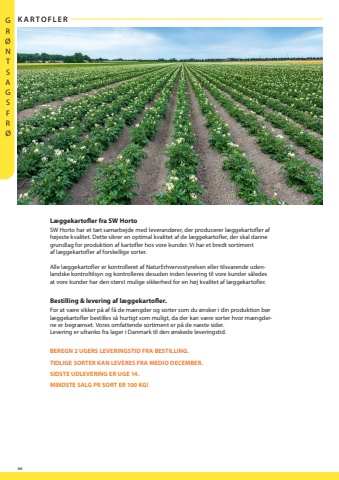GRKARTOFLERL%u00e6ggekartofler fra SW Horto SW Horto har et t%u00e6t samarbejde med leverand%u00f8rer, der producerer l%u00e6ggekartofler af h%u00f8jeste kvalitet. Dette sikrer en optimal kvalitet af de l%u00e6ggekartofler, der skal danne grundlag for produktion af kartofler hos vore kunder. Vi har et bredt sortiment af l%u00e6ggekartofler af forskellige sorter. Alle l%u00e6ggekartofler er kontrolleret af NaturErhvervsstyrelsen eller tilsvarende udenlandske kontroltilsyn og kontrolleres desuden inden levering til vore kunder s%u00e5ledes at vore kunder har den st%u00f8rst mulige sikkerhed for en h%u00f8j kvalitet af l%u00e6ggekartofler.Bestilling & levering af l%u00e6ggekartofler.For at v%u00e6re sikker p%u00e5 af f%u00e5 de m%u00e6ngder og sorter som du %u00f8nsker i din produktion b%u00f8r l%u00e6ggekartofler bestilles s%u00e5 hurtigt som muligt, da der kan v%u00e6re sorter hvor m%u00e6ngderne er begr%u00e6nset. Vores omfattende sortiment er p%u00e5 de n%u00e6ste sider. Levering er ufranko fra lager i Danmark til den %u00f8nskede leveringstid.BEREGN 2 UGERS LEVERINGSTID FRA BESTILLING.TIDLIGE SORTER KAN LEVERES FRA MEDIO DECEMBER.SIDSTE UDLEVERING ER UGE 14. MINDSTE SALG PR SORT ER 100 KG!