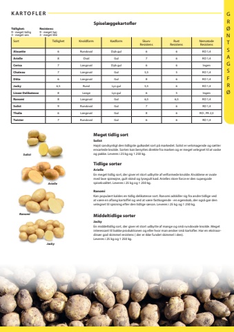 67KARTOFLERMeget tidlig sortSolistH%u00f8jst sandsynligt den tidligste gulk%u00f8det sort p%u00e5 markedet. Solist er velsmagende og s%u00e6tter ensartede knolde. Sorten kan benyttes direkte fra marken og er meget velegnet til at vaske og pakke. Leveres i 25 kg og 1 250 kg.Tidlige sorterArielleEn meget tidlig sort, der giver et stort udbytte af velformede knolde. Knoldene er ovale med lave spire%u00f8jne, gult skind og lysegult k%u00f8d. Arielles store force er den supergode spisekvalitet. Leveres i 25 kg og 1 250 kg.RanomiKan popul%u00e6rt kaldes en tidlig delikatesse sort. Ranomi adskiller sig fra andre tidlige vedat v%u00e6re en aflang kartoffel og ved at v%u00e6re fastkogende - en egenskab, der ogs%u00e5 g%u00f8r den velegnet til spisning efter den tidlige s%u00e6son. Leveres i 25 kg og 1 250 kg.Middeltidlige sorterJackyEn middeltidlig sort, der giver et stort udbytte af mange og sm%u00e5 rundovale knolde. Meget interessant til bakke produktionen og eller hvor man %u00f8nsker sm%u00e5 kartofler. Har en ekstraordin%u00e6r god skimmel resistens ( der er ikke fundet skimmel i den). Leveres i 25 kg og 1 250 kg.Spisel%u00e6ggekartoflerSortTidlighetKnoldformK%u00f8dformSkurv ResistensRust ResistensNematode ResistensAlouette6RundovalDyb gul66RO 1,4Arielle8OvalGul76RO 1,4Cerisa7LangovalDyb gul66IngenChateau7LangovalGul5,55RO 1,4Ditta6LangovalGul86RO 1,4Jacky6,5RundLys gul5,56RO 1,4Linzer Delikatesse8LangeLys gul65IngenRanomi8LangovalGul6,56,5RO 1,4Solist9RundovalGul76RO 1,4Thalia6LangovalGul86RO-, PA 2,3Twister7RundovalGul66RO 1,4Tidlighet: Resistens:9 - meget tidlig9 - meget h%u00f8j3 - meget sen3 - meget lilleArielleSolistRanomiJacky