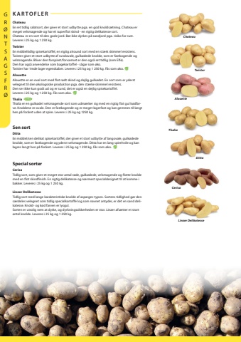 68GR%u00d8NTSAGSFR%u00d8KARTOFLERSpecial sorterCerisa Tidlig sort, som giver et meget stor antal r%u00f8de, gulk%u00f8dede, velsmagende og flotte knolde med en flot skindfinish. En rigtig delikatesse og n%u00e6rmest specialdesignet til at komme i Linzer DelikatesseTidlig sort med lange karakteristiske knolde af asparges-typen. Sortens tidlighed g%u00f8r dens%u00e6rdeles velegnet som tidlig specialkartoffel og som navnet antyder, er det en sand delikatesse. Knold- og k%u00f8d farven er lysgul. Sorten er utrolig nem at dyrke, og dyrkningssikkerheden er stor. Linzer afs%u00e6tter et stort antal knolde. Leveres i 25 kg og 1 250 kg.ChateauEn ret tidlig salatsort, der giver et stort udbytte pga. en god knolds%u00e6tning. Chateau er meget velsmagende og har et superflot skind - en rigtig delikatesse sort.Chateau er en sort til den gode jord. B%u00f8r ikke dyrkes p%u00e5 sandjord pga. risiko for rust.Leveres i 25 kg og 1 250 kg.Twister En middeltidlig spisekartoffel, en rigtig alround sort med en st%u00e6rk skimmel resistens.Twister giver et stort udbytte af rundovale, gulk%u00f8dede knolde, som er fastkogende og velsmagende. Bliver den forspiret/forvarmet er den ogs%u00e5 ret tidlig (som Elfe).Den har ogs%u00e5 anvendelse som bagekartoffel - s%u00e5gar som %u00f8ko.Twister har 1mde lager egenskaber. Leveres i 25 kg og 1 250 kg. F%u00e5s som %u00f8ko.AlouetteAlouette er en oval sort med flot r%u00f8dt skind og dejlig gulk%u00f8det. En sort som er yderst velegnet til den %u00f8kologsiske produktion pga. den st%u00e6rke skimmel resistens. Den ser ikke kun godt ud og er sund, det er ogs%u00e5 en dejlig spisekartoffel.Leveres i 25 kg og 1 250 kg. F%u00e5s som %u00f8ko.ThaliaThalia er en gulk%u00f8det velsmagende sort som udm%u00e6rker sig med en rigtig flot gul k%u00f8dfarve. Knoldene er ovale. Den er fastkogende og er meget lagerfast og kan gemmes til langt hen p%u00e5 for%u00e5ret uden at spire. Leveres i 25 kg og 1250 kg.Sen sortDitta En middel/sen delikat spisekartoffel, der giver et stort udbytte af langovale, gulk%u00f8dedeknolde, som er fastkogende og yderst velsmagende. Ditta har en lang spirehvile og kan lagres langt hen p%u00e5 for%u00e5ret. Leveres i 25 kg og 1 250 kg. F%u00e5s som %u00f8ko.PPPLinzer DelikatesseThaliaAlouetteTwisterChateauNYHED
