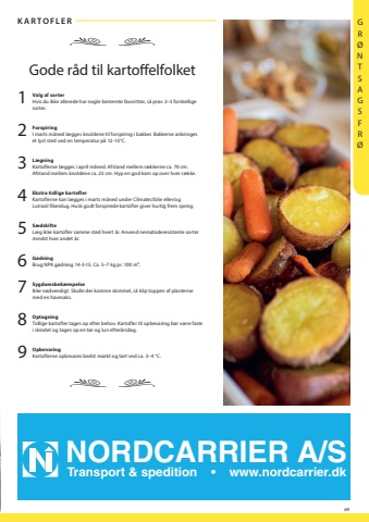 69KARTOFLER. ,Gode r%u00e5d til kartoffelfolketValg af sorter1Hvis du ikke allerede har nogle bestemte favoritter, s%u00e5 pr%u00f8v 2%u20133 forskellige sorter. Forspiring2I marts m%u00e5ned l%u00e6gges knoldene til forspiring i bakker. Bakkerne anbringes et lyst sted ved en temperatur p%u00e5 12%u201315%u00b0C.L%u00e6gning3Kartoflerne l%u00e6gges i april m%u00e5ned. Afstand mellem r%u00e6kkerne ca. 70 cm. Afstand mellem knoldene ca. 25 cm. Hyp en god kam op over hver r%u00e6kke.Ekstra tidlige kartofler4Kartoflerne kan l%u00e6gges i marts m%u00e5ned under Climatecfolie eller/og Lutrasil fiberdug. Husk godt forspirede kartofler giver hurtig frem spring.S%u00e6dskifte5L%u00e6g ikke kartofler samme sted hvert %u00e5r. Anvend nematoderesistente sorter mindst hver andet %u00e5r.G%u00f8dning6Brug NPK g%u00f8dning 14-3-15. Ca. 5%u20137 kg pr. 100 m%u00b2.Sygdomsbek%u00e6mpelse 7Ikke n%u00f8dvendigt. Skulle der komme skimmel, s%u00e5 klip toppen af planterne med en havesaks.Optagning8Tidlige kartofler tages op efter behov. Kartofler til opbevaring b%u00f8r v%u00e6re faste i skindet og tages op en t%u00f8r og lun efter%u00e5rsdag.Opbevaring9Kartoflerne opbevares bedst m%u00f8rkt og t%u00f8rt ved ca. 3%u20134 %u00b0C.. ,NORDCARRIER A/STransport & spedition %u2022 www.nodcarrier.dkUDKAST 04062013KKC A/S