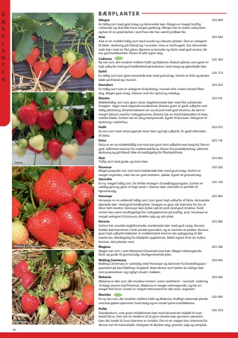 70B%u00c6GlorielleMalwinaB%u00c6RPLANTERAllegroEn tidlig sort med god smag og skinnende b%u00e6r. Allegro er meget kraftig voksende og skal ikke have meget g%u00f8dning. Allegro har et st%u00e6rk rodsystem og kan til vis grad dyrkes i jord hvor der har v%u00e6ret jordb%u00e6r f%u00f8r.225 209Asia Asia er en middel tidlig sort med sunde og robuste planter. Den er velegnet til b%u00e5de dyrkning p%u00e5 friland og i tunneler. Asia er storfrugtet, har skinnende r%u00f8de b%u00e6r med en flot glans. B%u00e6rene er koniske og faste med god aroma. De har god holdbarhed. Passer til alle typer salg.225 402Cadenza Ny sen sort, der modner mellem Faith og Malwina. Robust plante, som giver et h%u00f8jt udbytte med god holdbarhed p%u00e5 b%u00e6rrene. God smag og glansfulde b%u00e6r.225 365Dahli En tidlig sort som giver ensartede b%u00e6r med god smag. Sorten er frisk og dyrkes b%u00e5de p%u00e5 friland og i tunnel.225 172Darselect En tidlig sort som er velegnet til dyrkning i tunnel eller under lutrasil fiberdug. Meget god smag. F%u00f8lsom over for spind og meldug.225 222Elsanta Middeltidlig sort som giver store, kegleformede b%u00e6r med flot udseende. Smagen stiger med stigende modenhed. Elsanta giver et godt udbytte ved tidlig plantning. Elsanta beh%u00f8ver en sund jord med god struktur, da den er meget f%u00f8lsom overfor rodsygdomme. Elsanta har en bred bladv%u00e6kst af stive, st%u00e6rke blade. Sorten har en lang h%u00f8stperiode. Egnet til konsum. Velegnet til dyrkning i v%u00e6ksthus.225 312Faith En sen sort med velsmagende store b%u00e6r og h%u00f8jt udbytte. Et godt alternativ til Salsa.225 572Falco Falco er en ny middeltidlilg sort som kan give stort udbytte over lang tid. Den er god, velformet med en fin mellemr%u00f8d farve. Passer til tunneldyrkning, substratdyrkning og p%u00e5 friland. Ikke s%u00e5 modtagelig for Phytophthora.225 118Flair Tidlig sort med gode og store b%u00e6r.225 422Florence Meget popul%u00e6r sen sort med m%u00f8rker%u00f8de b%u00e6r med god smag. Sorten er meget vegetativ, men har en god resistens pakke. Egnet til grossistsalg.225 232GlorielleEn ny meget tidlig sort, fra Stefan Kraege%u00b4s for%u00e6dlingsprogram. Sorten er v%u00e6ldig god og giver et h%u00f8jt antal 1. klasses b%u00e6r. Glorielle er perfekt til hjemmesalg.225 165Honeoye Honeoye er en velkendt tidlig sort, som giver h%u00f8jt udbytte af faste, skinnende dybr%u00f8de b%u00e6r med god holdbarhed. Smagen er god, n%u00e5r b%u00e6rrene for lov at blive helt modne. Honeoye skal dyrkes p%u00e5 let jord med god struktur, fordi sorten kan v%u00e6re modtagelige for rodsygdomme p%u00e5 kraftig jord. Honeoye er meget velegnet til konsum, direkte salg og selv pluk.225 302Korona Sorten har smukke kegleformede, m%u00f8rker%u00f8de b%u00e6r med god smag. Korona holder b%u00e6rst%u00f8rrelsen i hele plukke perioden, og er nemme at plukke. Korona giver h%u00f8jt udbytte.V%u00e6ksten er middelst%u00e6rk med en l%u00f8s opbygning af det m%u00f8rke l%u00f8v. Modtagelig for bladplet sygdomme. Bedst egnet til et %u00e5rs kultur. Korona skal plantes sent.225 282Magnus Meget sen sort ( som Malwina) Glinsende lyse b%u00e6r. Meget velsmagende, faste og gode til grossistsalg. Hurtigvoksende plan.225 160Malling Centenary Malling Centenary er samtidig med Honeoye og kommer fra for%u00e6dlingsprogrammet p%u00e5 East Malling i England. Med denne sort h%u00f8ster du tidlige b%u00e6r som pr%u00e6senterer sig rigtigt smukt i bakken.225 432MalwinaMalwina er den sort, der modner senest i vores sortiment %u2013 normalt omkring 10 dage senere end Florence. Malwina er meget velsmagende, og har en meget flot farve. Sorten er meget interessant for det sene segment.225 242MariekaEn ny sen sort, der modner mellem Faith og Malwina. Kraftigt voksende plante, som b%u00f8r g%u00f8des sparsomt. God smag og en smule lysere end Malwina.225 481Polka Standardsort, som giver middelstore b%u00e6r med skinnende middel til m%u00f8rker%u00f8d farve. Den har en tendens til at give mindre b%u00e6r gennem s%u00e6sonen. Is%u00e6r det andet %u00e5r hvor b%u00e6rrene er mindre. Der er en meget stor interesse for denne sort til marmelade. Velegnet til direkte salg, grossist salg og selvpluk.225 252NYHEDNYHED
