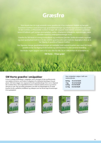 75som d%u00e6kker de behov som findes til villapl%u00e6ner fra slidst%u00e6rke blandinger til prydplaner. SW Horto l%u00e6gger stor v%u00e6gt p%u00e5 at f%u00e5 rette gr%u00e6sblandinger frem som er tilpasset det nordiske klima. Vores h%u00f8jtstillede kriterier er blandt andetat arterne og sorterne skal give en t%u00e6t, frisk og kraftig gr%u00e6spl%u00e6ne som t%u00e5ler lav klippeh%u00f8jde for at m%u00f8de kravene fra Bl.a. golfbaner, boldbaner og villaejere som har ekstra h%u00f8je forventninger til sin gr%u00e6spl%u00e6ne.0,8 kg16 st krt/kolli 1 kg16 st krt/kolli 2,0 kg8 st krt/kolli 2,5 kg8 st krt/kolli Som kunde kan du trygt anvende vores gr%u00e6sfr%u00f8 da vi har markedets bedste og l%u00e6ngste knowhow tradition med at fremtage gr%u00e6sfr%u00f8blandninger og enkelte toppr%u00e6senterende sorter til det nordiske proffesionelle marked. Vi tager alle opgaver med st%u00f8rste seri%u00f8sitet og kompetance til fodbold, golf, %u00f8vrige sportspladser, parker, villapl%u00e6ner, kirkeg%u00e5rde, vejskr%u00e5ninger, naturomr%u00e5der med bl.a vildengsblandninger m.m.Gr%u00e6sfr%u00f8 fra SW Horto er strengt kontrolleret og certificeret j%u00e6vnf%u00f8r Jordbruksverkets regels%u00e6t og med sporbarhed helt frem til den enkelte gr%u00e6sfr%u00f8 avler som med stor dygtighed sikrer at vi har tilgang til gr%u00e6sfr%u00f8 af h%u00f8jeste kvalitet.Der figurerer mange gr%u00e6sfr%u00f8blandninger p%u00e5 markedet med varieret kvalitet men med SW Horto gr%u00e6sfr%u00f8 s%u00e5 har du tilgang til det bedste og som kommer fra den seneste for%u00e6dling. Der findes ingen opgave som er for stor eller for lille. Du er velkommen til at kontakte os.SW Horto %u2013 Vi kan gr%u00e6s!Gr%u00e6sfr%u00f8