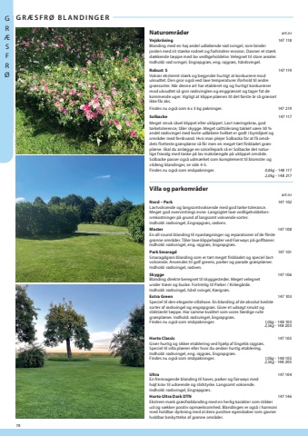 GRGR%u00c6SFR%u00d8 BLANDINGERNaturomr%u00e5derVejskr%u00e5ning 147 Blanding med en h%u00f8j andel udl%u00f8bende r%u00f8d svingel, som binder jorden med sit st%u00e6rke rodnet og forhindrer erosion. Danner et st%u00e6rk d%u00e6kkende t%u00e6ppe med lav vedligeholdelse. Velegnet til store arealer. Indhold: r%u00f8d svingel, Engrapgr%u00e6s, eng. rajgr%u00e6s, h%u00e5rdsvingel.Robust S147 119Vokser ekstremt st%u00e6rk og begynder hurtigt at konkurrere mod ukrudtet. Den gror ogs%u00e5 ved lave temperaturer iforhold til andre gr%u00e6ssorter. N%u00e5r denne art har etableret sig og hurtigt konkurrerer mod ukrudtet s%u00e5 gror r%u00f8dsvinglen og enggr%u00e6sset og tager fat de kommende uger. Vigtigt at klippe pl%u00e6nen tit det f%u00f8rste %u00e5r s%u00e5 gr%u00e6sset ikke f%u00e5r aks.Findes nu ogs%u00e5 som 6 x 3 kg pakninger. 147 219Solbacke 147 Meget smuk s%u00e5vel klippet eller uklippet. Lavt n%u00e6ringskrav, god t%u00f8rketolerence, t%u00e5ler skygge. Meget salttolerang takket v%u00e6re 50 % andel r%u00f8dsvingel med korte udl%u00f8bere hvilket er godt i bymilj%u00f8et og omr%u00e5der med ferskvand. Hvis man plejer Solbacka for at f%u00e5 omr%u00e5dets flotteste gr%u00e6spl%u00e6ne s%u00e5 f%u00e5r men en meget t%u00e6t finbladet gr%u00e6spl%u00e6ne. Skal du anl%u00e6gge en solcellepark s%u00e5 er Solbacke det naturlige fr%u00f8valg med tanke p%u00e5 lav maksl%u00e6ngde p%u00e5 uklippet omr%u00e5de. Solbacke passer ogs%u00e5 udm%u00e6rket som komplement til blomster og vildeng blandinger, se side 45. Findes nu ogs%u00e5 som sm%u00e5pakninger.0,8kg 148 1172,0kg - 148 217Villa og parkomr%u00e5derNord %u2013 Park147 102Lavtvoksende og langsomtvoksende med god t%u00f8rke tolerance. Meget god overvintrings evne. Langsigtet lave vedligeholdelsesomkostninger p%u00e5 grund af langsomt voksende sorter. Indhold: r%u00f8dsvingel, Engrapgr%u00e6s, r%u00f8dven.Master En all-round blanding til nyanl%u00e6gninger og reparationer af de fleste gr%u00f8nne omr%u00e5der. T%u00e5ler lave klippeh%u00f8jder ved Fairways p%u00e5 golfbaner. Indhold: r%u00f8dsvingel, eng. rajgr%u00e6s, Engrapgr%u00e6s.Park Smaragd 147 101Smaragdgr%u00f8n blanding som er t%u00e6t meget finbladet og speciel lavtvoksende. Anvendes til golf greens, parker og parade gr%u00e6spl%u00e6ner. Indhold: r%u00f8dsvingel, r%u00f8dven.Skygge 147 Blanding direkte beregnet til skyggesteder. Meget velegnet under tr%u00e6er og buske. Fortrinlig til Parker / Kirkeg%u00e5rde. Indhold: r%u00f8dsvingel, h%u00e5rd svingel, K%u00e6rgr%u00e6s.Extra Green 147 103Speciel til den elegante villahave. En blanding af de absolut bedste sorter af r%u00f8dsvingel og engrapgr%u00e6s. Giver et uds%u00f8gt smukt og slidst%u00e6rkt t%u00e6ppe. Har samme kvalitet som vores f%u00e6rdige rulle gr%u00e6spl%u00e6ner. Indhold: r%u00f8dsvingel, Engrapgr%u00e6s.Findes nu ogs%u00e5 som sm%u00e5pakninger.1,0kg- 148 1032,5kg - 148 203Horto Classic 147 105Giver hurtig og sikker etablering ved hj%u00e6lp af Engelsk rajgr%u00e6s. Speciel til villa pl%u00e6ner eller hvor du %u00f8nsker hurtig etablering. Indhold: r%u00f8dsvingel, eng. rajgr%u00e6s, Engrapgr%u00e6s.Findes nu ogs%u00e5 som sm%u00e5pakninger.1,0kg- 148 1052,5kg - 148 205Ultra 147 En fremragende blanding til haver, parker og fairways med h%u00f8jt krav til udseende og slidstyrke. Langsomt voksende. Indhold: r%u00f8dsvingel, Engrapgr%u00e6s.Horto Ultra Dark DTN147 146Ekstrem m%u00f8rk gr%u00e6sfr%u00f8blanding med en herlig karakter som stikker ud og v%u00e6kker positiv opm%u00e6rksomhed. Blandingen er ogs%u00e5 i harmoni med holdbar dyrkning med al dens positive egenskaber som gavner holdbar beskyttelse af gr%u00f8nne omr%u00e5der.