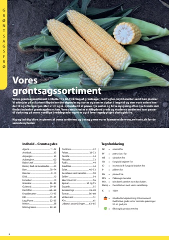 8GNF=normalfr%u00f8PF= pr%u00e6cision fr%u00f8OB= ubejdset fr%u00f8SB=fungicid bejdset fr%u00f8ID= insekticid & fungicid bejdset fr%u00f8P=pilleret fr%u00f8FG=primed fr%u00f8FPN=Paknings st%u00f8rrelseMin.=Mindste kvantitet som kan k%u00f8besDamp = Desinfiktion med varm vanddampK=1000=G%u00e5rdbutik/udplantning til konsumentKvalitative gode sorter i mindre pakninger till en god prisP=%u00d8kologisk produceret fr%u00f8Vores gr%u00f8ntsagssortiment omfatter fr%u00f8 til dyrkning af gr%u00f8ntsager, rodfrugter, krydderurter samt b%u00e6r planter. Vi arbejder p%u00e5 at kunne tilbyde kendte afgr%u00f8der og sorter og som er dyrket i lang tid og som vore avlere kender til og eftersp%u00f8rger. Men vi vil ogs%u00e5 opfordre til at pr%u00f8ve nye sorter og blive nysgerrig efter nye trends som findes indenfor gr%u00f8ntsagsbranchen. Vores ambition er at tilbyde et bredt og moderne sortiment som passer til dyrkning p%u00e5 vores nordlige breddegrader og vi er ogs%u00e5 leveringsdygtige i %u00f8kologisk fr%u00f8. Kig og lad dig blive inspireret af vores sortiment og bes%u00f8g gerne vores hjemmeside www.swhorto.dk for de seneste nyheder.Vores gr%u00f8ntsagssortimentAgurk.......................................11%u201312Artiskok..........................................13Asparges.......................................54Aubergine....................................60Baby-Leaf......................................50Beder, R%u00f8d- & Gulebeder.......44B%u00e6r............................................70%u201374B%u00f8nner.......................................9%u201310Dild..................................................10Fennikel.........................................10Gr%u00e6skar..................................35%u201343Gulerod..................................29%u201331Kartofler.................................66%u201369Krydderurter.........................13%u201315K%u00e5l.............................................15%u201321L%u00f8g/Porre..............................22%u201325Melon..............................................28Microgreens.........................52%u201353Pastinak..........................................32Peber.......................................32%u201333Persille...........................................34Physalis...........................................33Radis...............................................44R%u00e6ddike........................................44Salat.........................................46%u201353Resistens salatv%u00e6kster.............50Selleri.............................................54Skorzonerrod..............................56Spinat.................................51 og 55Squash............................................55Sukkermajs...........................26%u201328Tomat......................................56%u201360Vintersalat.....................................51%u00c6rt...................................................61Uds%u00e6ds anbefalinger.......63%u201365Indhold %u2013 Gr%u00f8ntsagsfr%u00f8Tegnforklaring