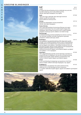 80GR%u00c6SFR%u00d8GR%u00c6SFR%u00d8 BLANDINGERGolf1:a tee 147 115En meget slid tolerant blanding, der kun indeholder top sorter der kan t%u00e5le lav klipning. Giver hurtig etablering af Tee. Indhold: r%u00f8dsvingel, Engrapgr%u00e6s, eng. rajgr%u00e6s.Eagle 147 100% r%u00f8d svingel, indeholder 40% r%u00f8dsvingel med korte udl%u00f8bere og 60% t%u00e6t r%u00f8dsvingel. Green kvalitet kun med top sorter.Fairway 147 Modst%u00e5r lave klippeh%u00f8jder med h%u00f8j skudt%u00e6thed. Indhold: r%u00f8dsvingel, Engrapgr%u00e6s.Festuca Fairway 147 121100 % r%u00f8dsvingel blanding til renovering af fairways men egner sig ogs%u00e5 til renoveringer hvor man %u00f8nsker Engelsk r%u00e6jgr%u00e6s eller engrapgr%u00e6s. Med Festuga Fairway bliver det en meget finbladet gr%u00e6splane med lange og korte udl%u00f8bere som lukker hurtigt.Park Smaragd147 101En finbladet blanding med h%u00f8j skudt%u00e6thed som danner en t%u00e6t og lavt voksende overflade. Anvendes til golf greens og parade gr%u00e6spl%u00e6ner. Indhold: r%u00f8dsvingel, r%u00f8dven.NordicSport147 Som supplement og reparationss%u00e5ning af alle slags sports og slidomr%u00e5der. Vi har udviklet produktet sammen med et verdensledende for%u00e6dlingsfirma med indhold af den nye generations tetraploid r%u00e6jgr%u00e6s og r%u00e6jgr%u00e6s med udl%u00f8bere. I NordicSport kombineres den nye generations Engelsk r%u00e6jgr%u00e6s hurtige etablering med engrapgr%u00e6ssets langtids holdbarhed og gode overvintringsevner.Indehold: Konventionelt r%u00e6jgr%u00e6s med tetraploid r%u00e6jgr%u00e6s og r%u00e6jgr%u00e6s med udl%u00f8bere + 35 % engrapgr%u00e6s.SuperSport147 100 % r%u00e6jgr%u00e6sblanding med den seneste teknologi. SuperSport er et godt alternativ til SnabbSport S da man f%u00e5r en hurtig renovering af slidte sportsomr%u00e5der. Meget slidst%u00e6rk og forbederede vinter h%u00e5rdhed. Indhold: Engelsk r%u00e6jgr%u00e6s og tetraploid r%u00e6jgr%u00e6s.MasterEn allround blanding til nyl%u00e6gninger og reparationer af de fleste gr%u00f8nne omr%u00e5der. Indhold: r%u00f8dsvingel, Engrapgr%u00e6s, eng. rajgr%u00e6s.SnabbSport S147 123Samme karakter som planstart men med en ekstrem hurtig etablering. Gror af alle blandinger p%u00e5 lavest temperatur, ca. 5 grader. Indeholder; Engelsk rajgr%u00e6s, rajgr%u00e6s med udl%u00f8bere og tetraploid rajgr%u00e6s.Bokskogens GK