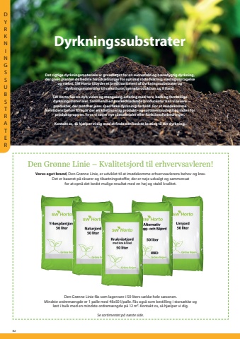 DyrkningssubstraterDDet rigtige dyrkningsmateriale er grundlaget for en succesfuld og b%u00e6redygtig dyrkning, der giver planten de bedste foruds%u00e6tninger for optimal rodudvikling, n%u00e6ringsoptagelse og v%u00e6kst. SW Horto tilbyder et bredt sortiment af dyrkningssubstrater og dyrkningsmaterialer til v%u00e6ksthuse, tunnelproduktion og friland.SW Horto har en dyb viden og mange%u00e5rig erfaring med t%u00f8rv, bark og forskellige dyrkningsmaterialer. Sammen med markedsledende producenter kan vi levere produkter, der matcher jeres specifikke dyrkningsforhold. For at im%u00f8dekomme fremtidens behov foreg%u00e5r der en kontinuerlig produkt- og sortimentsudvikling inden for produktgruppen, hvor vi s%u00f8ger nye r%u00e5materialer eller funktionsforbedringer.Kontakt os, s%u00e5 hj%u00e6lper vi dig med at finde den bedste l%u00f8sning til din dyrkning.Den Gr%u00f8nne Linie %u2013 Kvalitetsjord til erhvervsavleren!Vores eget brand, Den Gr%u00f8nne Linie, er udviklet til at im%u00f8dekomme erhvervsavlerens behov og krav.Det er baseret p%u00e5 r%u00e5varer og tils%u00e6tningsstoffer, der er n%u00f8je udvalgt og sammensatfor at opn%u00e5 det bedst mulige resultat med en h%u00f8j og stabil kvalitet.Den Gr%u00f8nne Linie f%u00e5s som lagervare i 50 liters s%u00e6kke hele s%u00e6sonen.Mindste ordrem%u00e6ngde er 1 palle med 48x50 l/palle. F%u00e5s ogs%u00e5 som bestilling i stors%u00e6kke ogl%u00f8st i bulk med en mindste ordrem%u00e6ngde p%u00e5 12 m%u00b3. Kontakt os, s%u00e5 hj%u00e6lper vi dig.Se sortimentet p%u00e5 n%u00e6ste side.