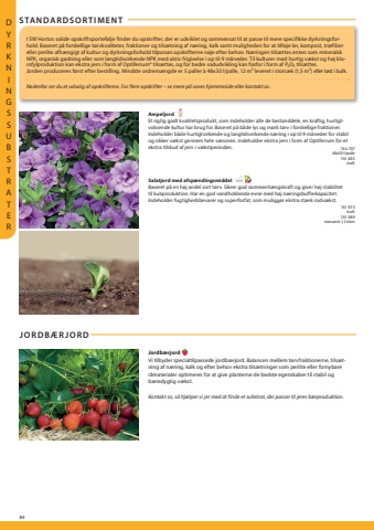 84DYRKNINGSSUBSTRATESTANDARDSORTIMENTAmpeljordEt rigtig godt kvalitetsprodukt, som indeholder alle de bestanddele, en kraftig, hurtigtvoksende kultur har brug for. Baseret p%u00e5 b%u00e5de lys og m%u00f8rk t%u00f8rv i forskellige fraktioner.Indeholder b%u00e5de hurtigtvirkende og langtidsvirkende n%u00e6ring i op til 9 m%u00e5neder for stabil og sikker v%u00e6kst gennem hele s%u00e6sonen. Indeholder ekstra jern i form af Optiferrum for et ekstra tilskud af jern i v%u00e6kstperioden.Salatjord med afsp%u00e6ndingsmiddelBaseret p%u00e5 en h%u00f8j andel sort t%u00f8rv. Sikrer god sammenh%u00e6ngskraft og giver h%u00f8j stabilitet til kubproduktion. Har en god vandholdende evne med h%u00f8j n%u00e6ringsbufferkapacitet.Indeholder fugtighedsbevarer og superfosfat, som muligg%u00f8r ekstra st%u00e6rk rodv%u00e6kst.48x50 l/pallestors%u00e6ck 1,5 kbmI SW Hortos solide opskriftsportef%u00f8lje finder du opskrifter, der er udviklet og sammensat til at passe til mere specifikke dyrkningsforhold. Baseret p%u00e5 forskellige t%u00f8rvkvaliteter, fraktioner og tils%u00e6tning af n%u00e6ring, kalk samt muligheden for at tilf%u00f8je ler, kompost, tr%u00e6fiber eller perlite afh%u00e6ngigt af kultur og dyrkningsforhold tilpasses opskrifterne n%u00f8je efter behov. N%u00e6ringen tils%u00e6ttes enten som mineralsk NPK, organisk g%u00f8dning eller som langtidsvirkende NPK med aktiv frigivelse i op til 9 m%u00e5neder. Til kulturer med hurtig v%u00e6kst og h%u00f8j klorofylproduktion kan ekstra jern i form af Optiferrum%u00ae tils%u00e6ttes, og for bedre rodudvikling kan fosfor i form af P%u2082O%u2085 tils%u00e6ttes.Jorden produceres f%u00f8rst efter bestilling. Mindste ordrem%u00e6ngde er 5 paller %u00e0 48x50 l/palle, 12 m%u00b3 leveret i stors%u00e6k (1,5 m%u00b3) eller l%u00f8st i bulk.Nedenfor ser du et udvalg af opskrifterne. For flere opskrifter %u2013 se mere p%u00e5 vores hjemmeside eller kontakt os.Jordb%u00e6rjordVi tilbyder specialtilpassede jordb%u00e6rjord. Balancen mellem t%u00f8rvfraktionerne, tils%u00e6tning af n%u00e6ring, kalk og efter behov ekstra tils%u00e6tninger som perlite eller fornybare r%u00e5materialer optimeres for at give planterne de bedste egenskaber til stabil og b%u00e6redygtig v%u00e6kst.Kontakt os, s%u00e5 hj%u00e6lper vi jer med at finde et substrat, der passer til jeres b%u00e6rproduktion.