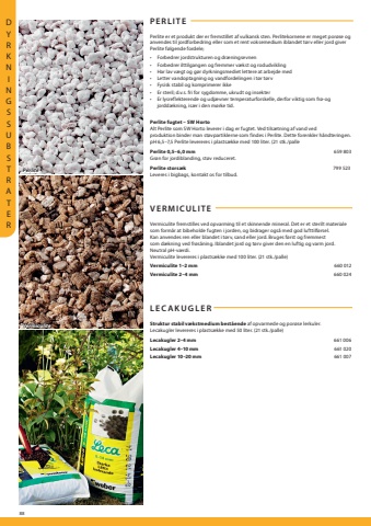 88DYRKNINGSSUBSTRATEPerlitePE R LI T E Perlite er et produkt der er fremstillet af vulkansk sten. Perlitekornene er meget por%u00f8se og anvendes til jordforbedring eller som et rent voksemedium iblandet t%u00f8rv eller jord giver Perlite f%u00f8lgende fordele;%u2022Forbedrer jordstrukturen og dr%u00e6ningsevnen%u2022Forbedrer ilttilgangen og fremmer v%u00e6kst og rodudvikling %u2022Har lav v%u00e6gt og g%u00f8r dyrkningsmediet lettere at arbejde med%u2022Letter vandoptagning og vandfordelingen i t%u00f8r t%u00f8rv%u2022Fysisk stabil og komprimerer ikke%u2022Er steril; d.v.s. fri for sygdomme, ukrudt og insekter%u2022Er lysreflekterende og udj%u00e6vner temperaturforskelle, derfor viktig som fr%u00f8-og jordd%u00e6kning, is%u00e6r i den m%u00f8rke tid. Perlite fugtet %u2013 SW Horto Alt Perlite som SW Horto leverer i dag er fugtet. Ved tils%u00e6tning af vand ved produktion binder man st%u00f8vpartiklerne som findes i Perlite. Dette forenkler h%u00e5ndteringen. pH 6,5%u20137,5Perlite levereres i plasts%u00e6kke med 100 liter. (21 stk./pallePerlite 0,5%u20136,0 mm659 803Gr%u00f8n for jordiblanding, st%u00f8v reduceret. Perlite stors%u00e6k799 523Leveres i bigbags, kontakt os for tilbud. VERMICULITEVermiculite fremstilles ved opvarming til et skinnende mineral. Det er et sterilt materiale som form%u00e5r at bibeholde fugten i jorden, og bidrager ogs%u00e5 med god lufttilf%u00f8rsel. Kan anvendes ren eller blandet i t%u00f8rv, sand eller jord. Bruges f%u00f8rst og fremmest som d%u00e6kning ved fr%u00f8s%u00e5ning. Iblandet jord og t%u00f8rv giver den en luftig og varm jord. Neutral pH-v%u00e6rdi.Vermiculite levereres i plasts%u00e6kke med 100 liter. (21 stk./palle)Vermiculite 1%u20132 mm660 012Vermiculite 2%u20134 mm660 024LECAKUGLERStruktur stabil v%u00e6kstmedium best%u00e5ende af opvarmede og por%u00f8se lerkuler. Lecakugler levereres i plasts%u00e6kke med 50 liter. (21 stk./palle)Lecakugler 2%u20134 mm661 006Lecakugler 4%u201310 mm661 020Lecakugler 10%u201320 mm661 007