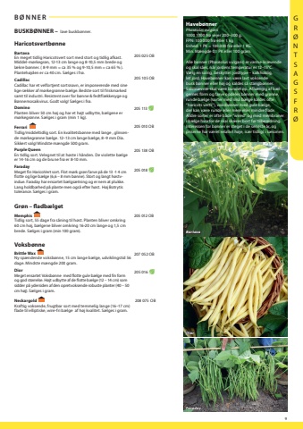 9FaradayDiorHaveb%u00f8nnerPhaseolus vulgaris1000 1000 fr%u00f8 vejer 200%u2013300 g.FPN: 100 000 fr%u00f8 eller 1 kgEnhed: 1 PK = 100.000 fr%u00f8 eller 1 KG.Min. M%u00e6ngde 0,1 PK eller 100 gram.Alle b%u00f8nner (Phaseolus vulgaris) er varme-kr%u00e6vendeog skal s%u00e5es, n%u00e5r jordens temperatur er 12%u201315%u00b0C.V%u00e6lg en solrig, beskyttet jordtype %u2013 kalkholdig,let jord. Haveb%u00f8nner kan v%u00e6re lavt voksendebusk b%u00f8nner eller h%u00f8j og kaldes s%u00e5 stangb%u00f8nner.Sidstn%u00e6vnte skal v%u00e6re bundet op. Afh%u00e6ngig af b%u00e6lgernes form og farve opdeles b%u00f8nner med gr%u00f8nne,runde b%u00e6lge (sorter med sm%u00e5 b%u00e6lge kaldes ofte%u201dharicots verts%u201d), voksb%u00f8nner med gule b%u00e6lge,der kan v%u00e6re runde eller mere eller mindre flade.%u00c6ldre sorter er ofte b%u00e5de %u201dwired%u201d og med membraneri b%u00e6lge hvorfor de skal sk%u00e6res bort f%u00f8r tilberedning.Interessen for b%u00f8nner er steget i de seneste %u00e5r, ogpriserne har v%u00e6ret relativt h%u00f8je, is%u00e6r tidligt i s%u00e6sonen. B%u00d8NNERBUSKB%u00d8NNER %u2013 lave buskb%u00f8nner.Haricotsvertb%u00f8nneBartavaEn meget tidlig Haricotsvert sort med stort og tidlig afkast. Middel-m%u00f8rkegr%u00f8n, 12-13 cm lange og 8-10,5 mm brede og l%u00e6kre b%u00f8nner. ( 8-9 mm = ca 35 % og 9-10,5 mm = ca 65 % ). Planteh%u00f8jden er ca 40 cm. S%u00e6lges i fr%u00f8.205 025CadillacCadillac har et velfortjent sortsnavn, er imponerende med sine lige r%u00e6kker af m%u00f8rkegr%u00f8nne b%u00e6lge. Bedste sort til friskmarked samt til industri. Resistent over for b%u00f8nne & fedtfl%u00e6kkesyge og B%u00f8nnemosaikvirus. Godt valg! S%u00e6lges i fr%u00f8.205 105 DominoPlanten bliver 50 cm h%u00f8j og har et h%u00f8jt udbytte, b%u00e6lgene er m%u00f8rkegr%u00f8nne. S%u00e6lges i gram (min 1 kg).205 113 Ferrari Tidlig/middeltidlig sort. En kvalitetsb%u00f8nne med lange , glinsende m%u00f8rkegr%u00f8nne b%u00e6lge. 12%u201313 cm lange b%u00e6lge, 8%u20139 mm Dia. Sikkert valg! Mindste m%u00e6ngde 500 gram.205 010 Purple QueenEn tidlig sort. Velegnet til at h%u00f8ste i h%u00e5nden. De violette b%u00e6lge er 14-16 cm og de brune fr%u00f8 er 8-10 mm. 205 138 FaradayMeget fin HaricoVert sort. Flot m%u00f8rk gr%u00f8n farve p%u00e5 de 13 -1 4 cm flotte og lige b%u00e6lge (6,6 %u2013 8 mm b%u00f8nne). Stort og langt h%u00f8stvindue. Faraday har ensartet b%u00e6lgs%u00e6tning og er nem at plukke. Lang holdbarhed p%u00e5 plante men ogs%u00e5 efter h%u00f8st. H%u00f8j Botrytis tolerance.S%u00e6lges i gram.205 018 Gr%u00f8n %u2013 fladb%u00e6lgetMemphis Tidlig sort, 55 dage fra s%u00e5ning til h%u00f8st. Planten bliver omkring 60 cm h%u00f8j, b%u00e6lgene bliver omkring 16-20 cm lange og 1,5 cm brede. 205 012Voksb%u00f8nneBrittle Wax Ny sp%u00e6ndende voksb%u00f8nne, 15 cm lange b%u00e6lge, udviklingstid 56 dage. Mindste m%u00e6ngde 200 gram. 207 052DiorMeget ensartet Voksb%u00f8nne med flotte gule b%u00e6lge med fin form og god st%u00f8rrelse. H%u00f8jt udbytte af de flotte b%u00e6lge (12 %u2013 14 cm) som sidder p%u00e5 ydersiden af den opretvoksende robuste planter (40 %u2013 50 cm h%u00f8j). S%u00e6lges i gram.205 016 Neckargold Kraftig voksende, frugtbar sort med temmelig lange (16%u201317 cm) flade til elliptiske, wire-fri b%u00e6lge af h%u00f8j kvalitet. S%u00e6lges i gram.208 075