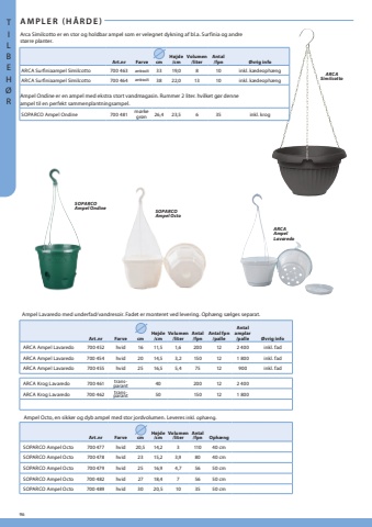 96TILBEH%u00d8RAmpel Lavaredo med underfad/vandresoir. Fadet er monteret ved levering. Oph%u00e6ng s%u00e6lges separat.Arca Similcotto er en stor og holdbar ampel som er velegnet dykning af bl.a. Surfinia og andre st%u00f8rre planter.AMPLER (H%u00c5RDE)ARCASimilcottoSOPARCOAmpel OctoSOPARCOAmpel OndineArt.nrFarvecmH%u00f8jde/cmVolumen/literAntal/fpn%u00d8vrig infoARCA Surfiniaampel Similcotto700 463antracit3319,0810inkl. k%u00e6deoph%u00e6ngARCA Surfiniaampel Similcotto700 464antracit3822,01310inkl. k%u00e6deoph%u00e6ngSOPARCO Ampel Ondine700 481m%u00f8rke gr%u00f8n26,423,5635inkl. krogAmpel Ondine er en ampel med ekstra stort vandmagasin. Rummer 2 liter. hvilket g%u00f8r denne ampel til en perfekt sammenplantningsampel.ARCAAmpel LavaredoArt.nrFarvecmH%u00f8jde/cmVolumen/literAntal/fpnAntal fpn/palleamplar/palle%u00d8vrig infoARCA Ampel Lavaredo700 452hvid1611,51,6200122 400inkl. fadARCA Ampel Lavaredo700 454hvid2014,53,2150121 800inkl. fadARCA Ampel Lavaredo700 455hvid2516,55,47512900inkl. fadARCA Krog Lavaredo700 461transparant40200122 400ARCA Krog Lavaredo700 462transparant50150121 800Art.nrFarvecmH%u00f8jde/cmVolumen/literAntal/fpnOph%u00e6ngSOPARCO Ampel Octo700 477hvid20,514,2311040 cmSOPARCO Ampel Octo700 478hvid2315,23,98040 cmSOPARCO Ampel Octo700 479hvid2516,94,75650 cmSOPARCO Ampel Octo700 482hvid2718,475650 cmSOPARCO Ampel Octo700 489hvid3020,5103550 cmAmpel Octo, en sikker og dyb ampel med stor jordvolumen. Leveres inkl. oph%u00e6ng.